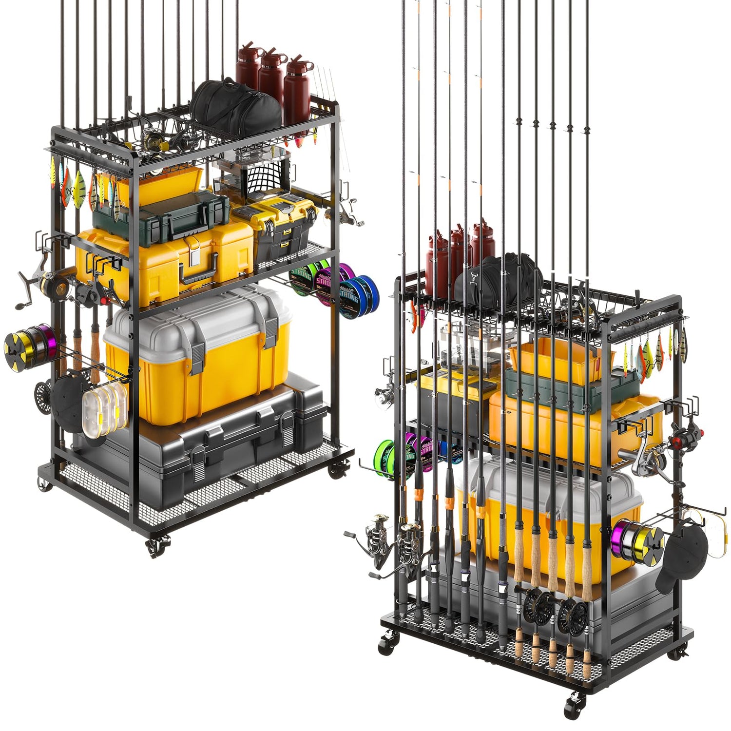 - 【High-Capacity 12-Rod Holder】-Four-side storage design, without wasting any bit of storage space. The back side of the garage fishing rod storage cart is suitable for all types of fishing rods and can store a total of 12 pieces. Including spinning Rod、trolling Rod、Fly Fishing Rod、Spinning Rod、Casting Rod and so on. Ideal for most types of fishing gear.