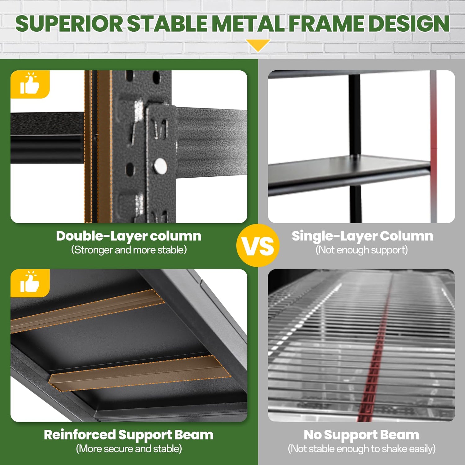 - ⭐【 Upgraded Dual-Layer Columns】 Most of the shelves on the market use a single-layer column design, which is prone to shaking and bending when storing heavy items, or even collapse, causing safety hazards. Our heavy-duty shelves use a double-layer column design, which significantly improves stability and load-bearing capacity. It can remain stable even under heavier loads, It is extremely safe, and has a long service life.