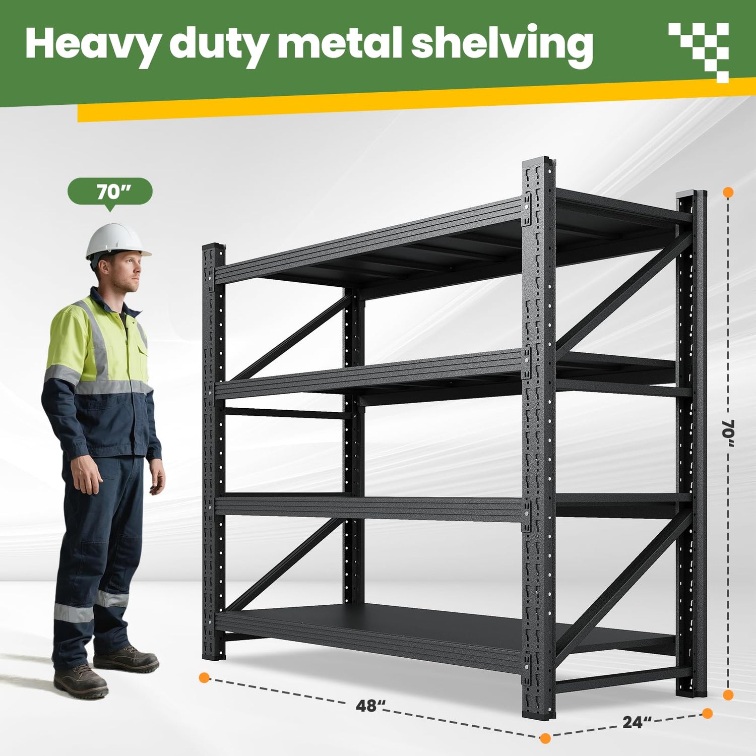 STANI 70" H 3000LBS Capacity Heavy Duty 4-Tier Adjustable Shelves Metal Garage Shelving Industrial Shelves Heavy Tools Utility Rack Shelf for Basement/Garage/Warehouse/Shop Black 48" Wx24 Dx69 H