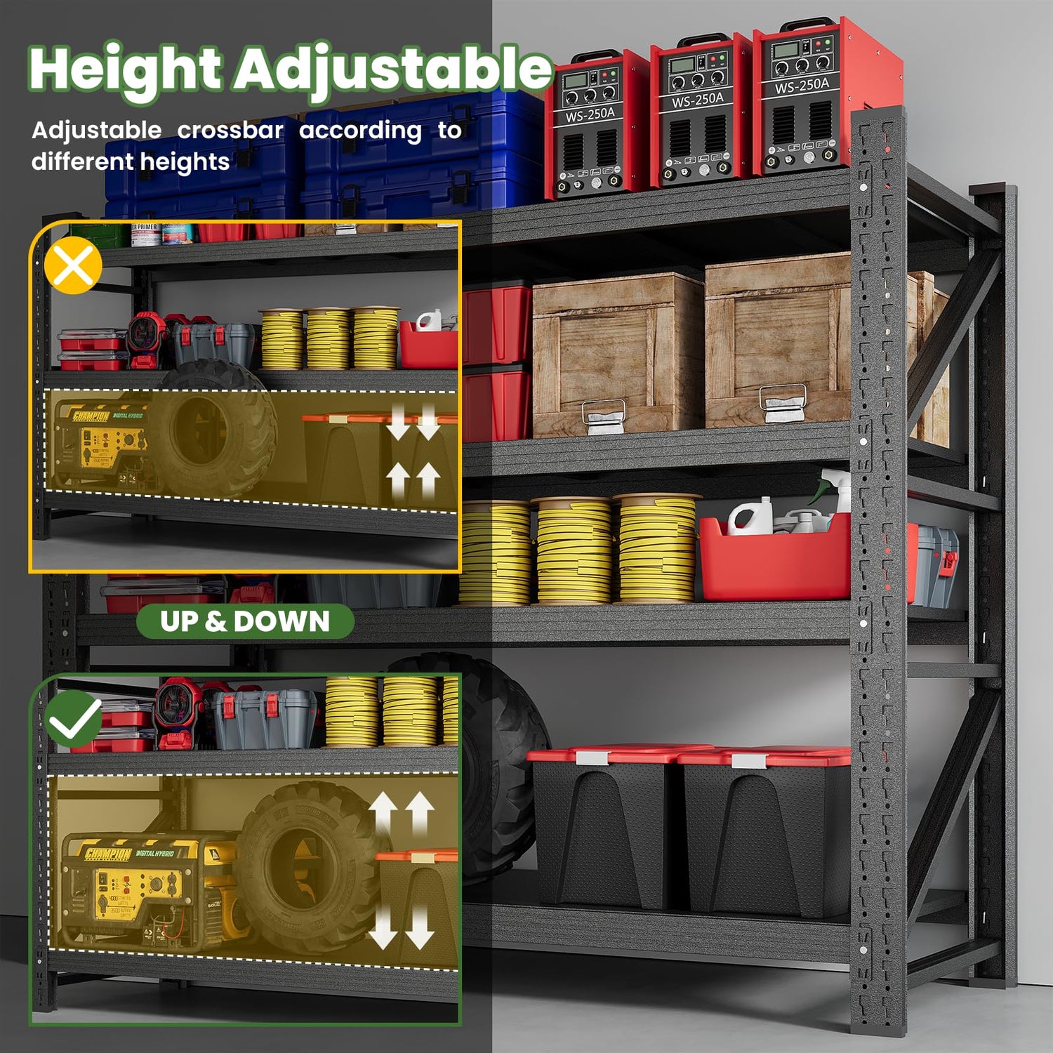 - ⭐【Adjustable Metal Industrial Shelves】 The heavy-duty shelves are designed with adjustable connectors. Each layer can be adjusted according to the height of the items. You only need to adjust the height by moving the beams to meet your different storage needs.