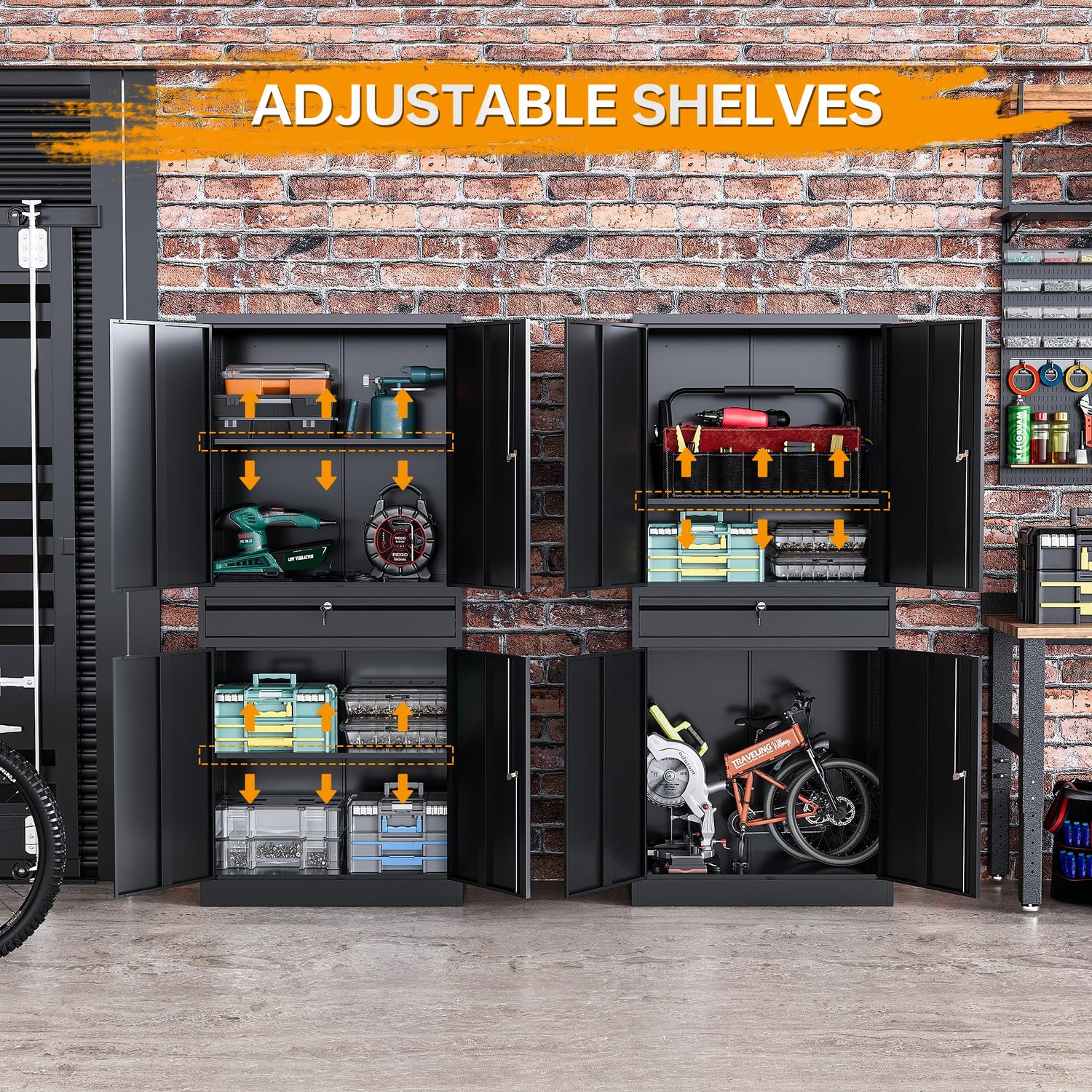 STANI Metal Garage Storage Cabinets with Drawer, 4 Doors Tool Storage Cabinet with 2 Adjustable Shelves, 71"-Lock Steel Locking Cabinet for Garage Utility Room Home Office (Black, 0 Wheel-71 H)