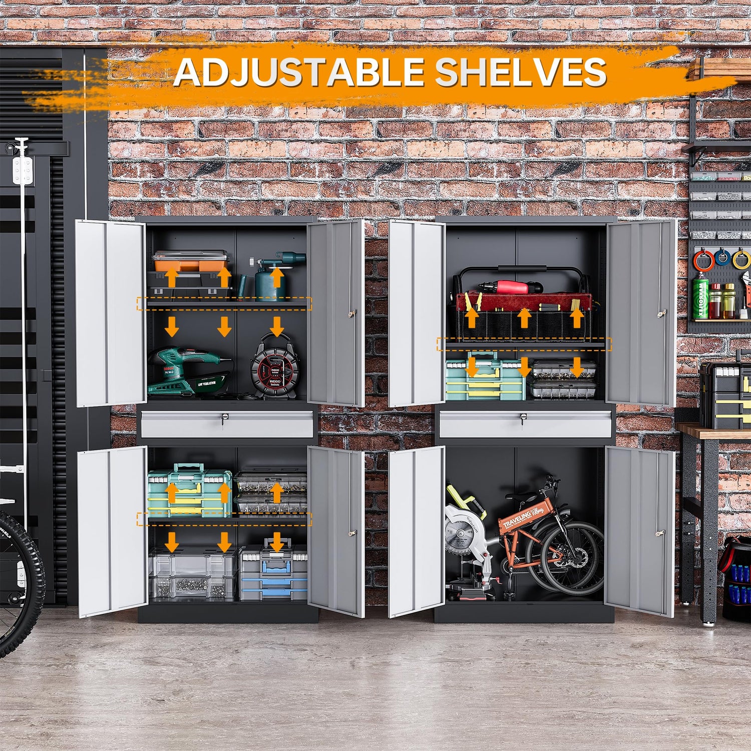 STANI Metal Garage Storage Cabinets with Drawer, 4 Doors Tool Storage Cabinet with 2 Adjustable Shelves, 71"-Lock Steel Locking Cabinet for Garage Utility Room Home Office (Black Grey, 0 Wheel-71 H)
