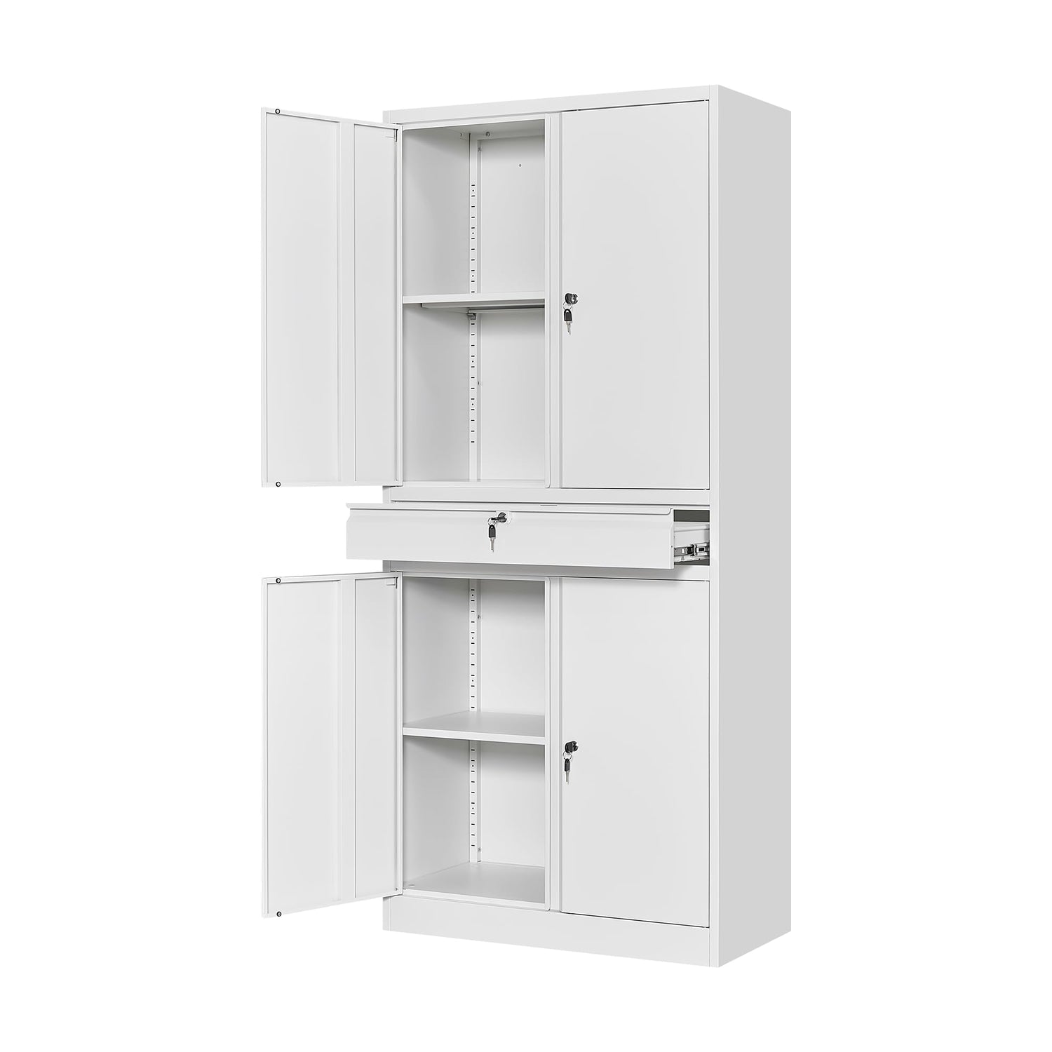 STANI Metal Garage Storage Cabinets with Drawer, 4 Doors Tool Storage Cabinet with 2 Adjustable Shelves, 71"-Lock Steel Locking Cabinet for Garage Utility Room Home Office (White, 0 Wheel-71 H)