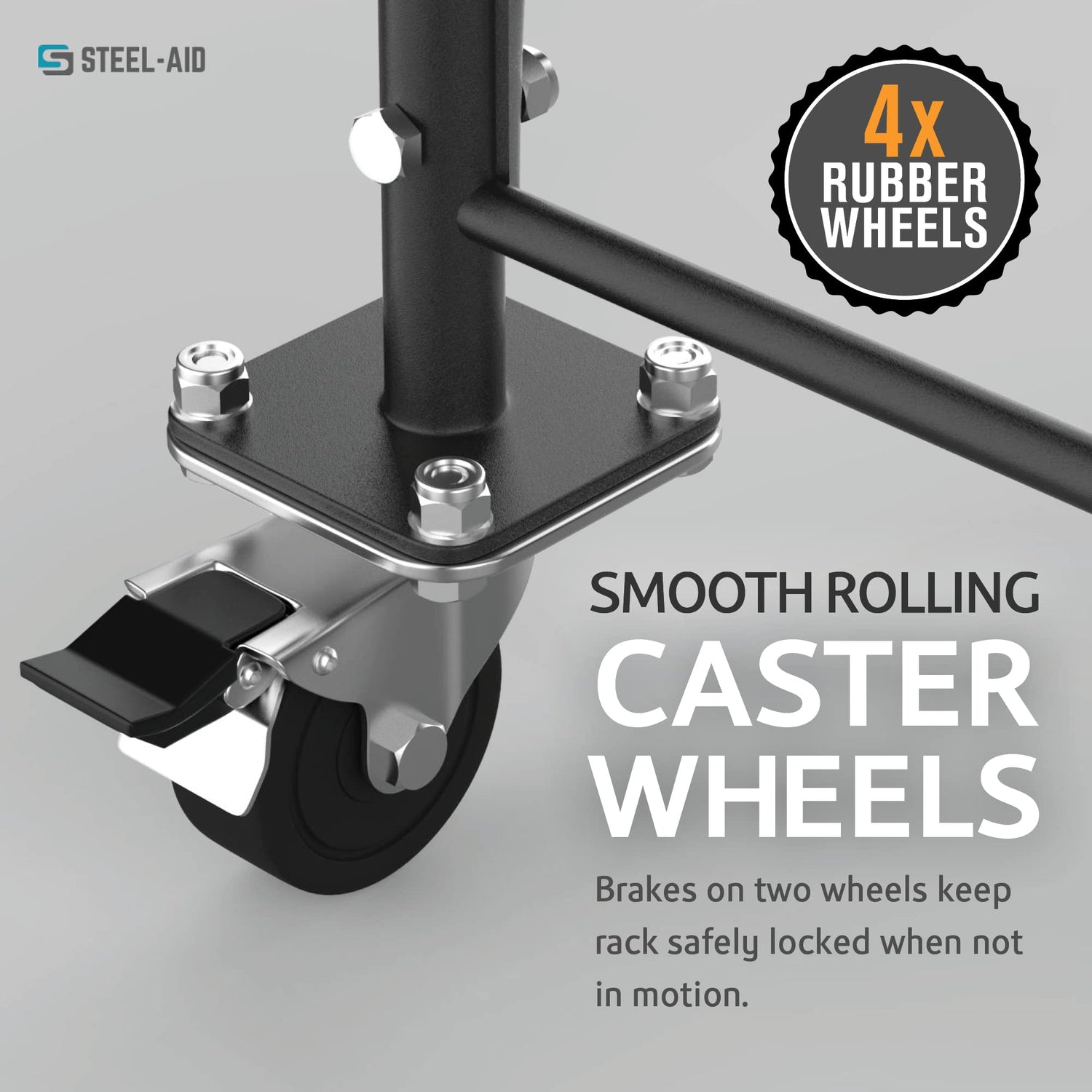 • π‡π„π€π•π˜ πƒπ”π“π˜ πŒπ„π“π€π‹ π…π‘π€πŒπ„ - The tire rack is engineered with a heavy duty metal frame that is easy to assemble. Sturdy, durable, and equipped with side brakes on each wheel to keep the rack safely locked in place when not in motion.