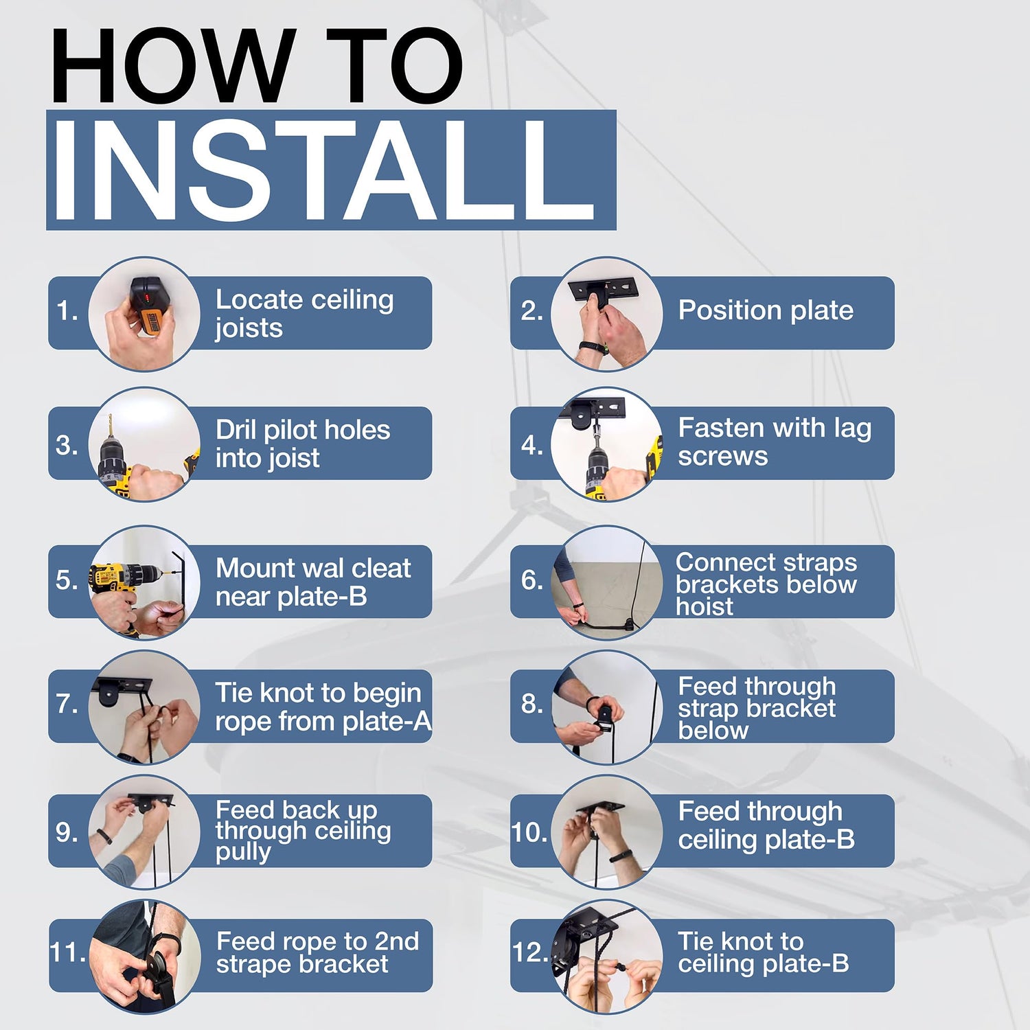 - EASY TO INSTALL & USE – This pulley system for garage organization installs parallel or perpendicular to joists for maximum flexibility. Adjustable straps make it simple to secure different cargo carriers, turning your garage into a functional storage system with effortless lifting.