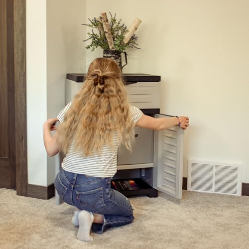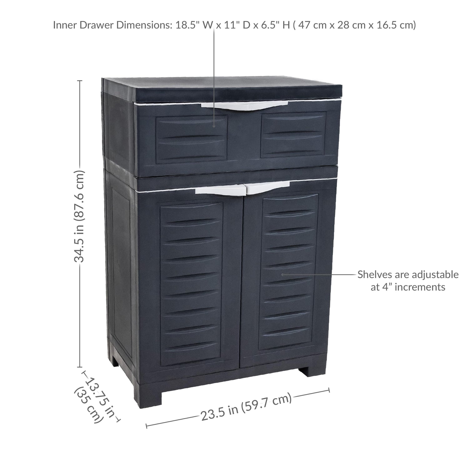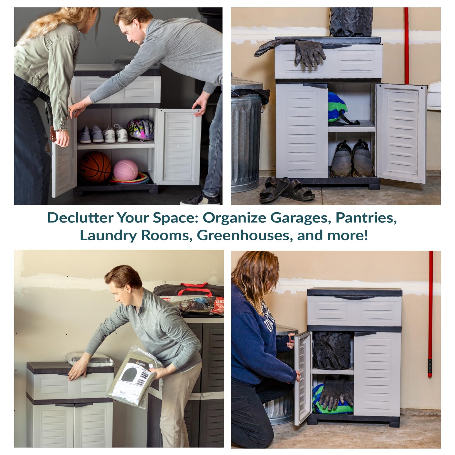 - VERSATILE STORAGE SOLUTION: Use the small plastic storage cabinet with doors to contain tools, extension cords, and more in the garage, add it to your laundry room storage for detergents and laundry supplies, or in an office to organize office supplies. It includes an anti-tip kit to securely anchor the cabinet to the wall for additional stability.