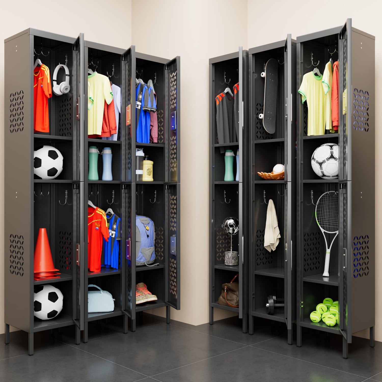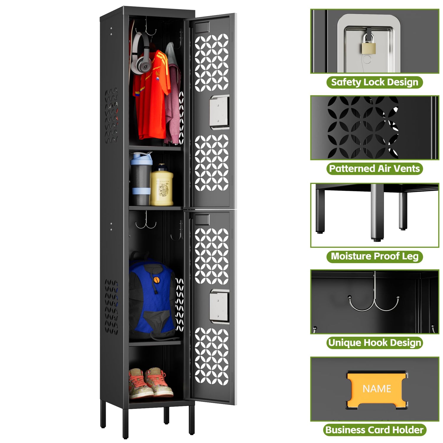 • 【Unique Design】Metal locker doors are equipped with patternes air vents and Business card holder,which help you keep items dry and ventilated,eliminating odor and moisture.metal locker equipped with standing feet can be kept off the floor for easy cleaning.