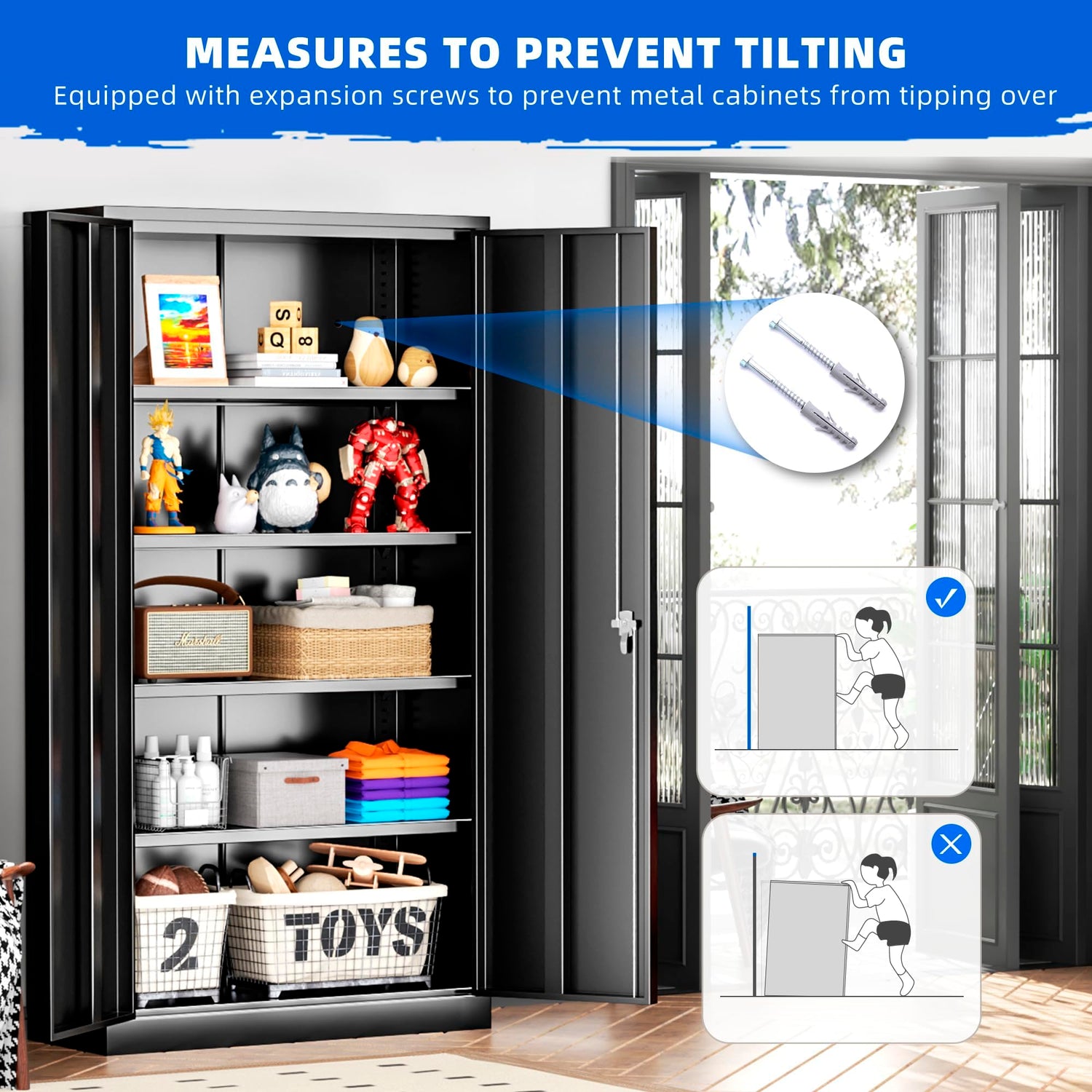 - 🗄️【High-Quality Materials】: This tall cabinet with doors and shelves is made of cold-rolled steel, with a reinforced structure that makes the metal cabinet more sturdy and durable. The black cabinet is coated with durable electrostatic powder, which makes cleaning it more effortless.