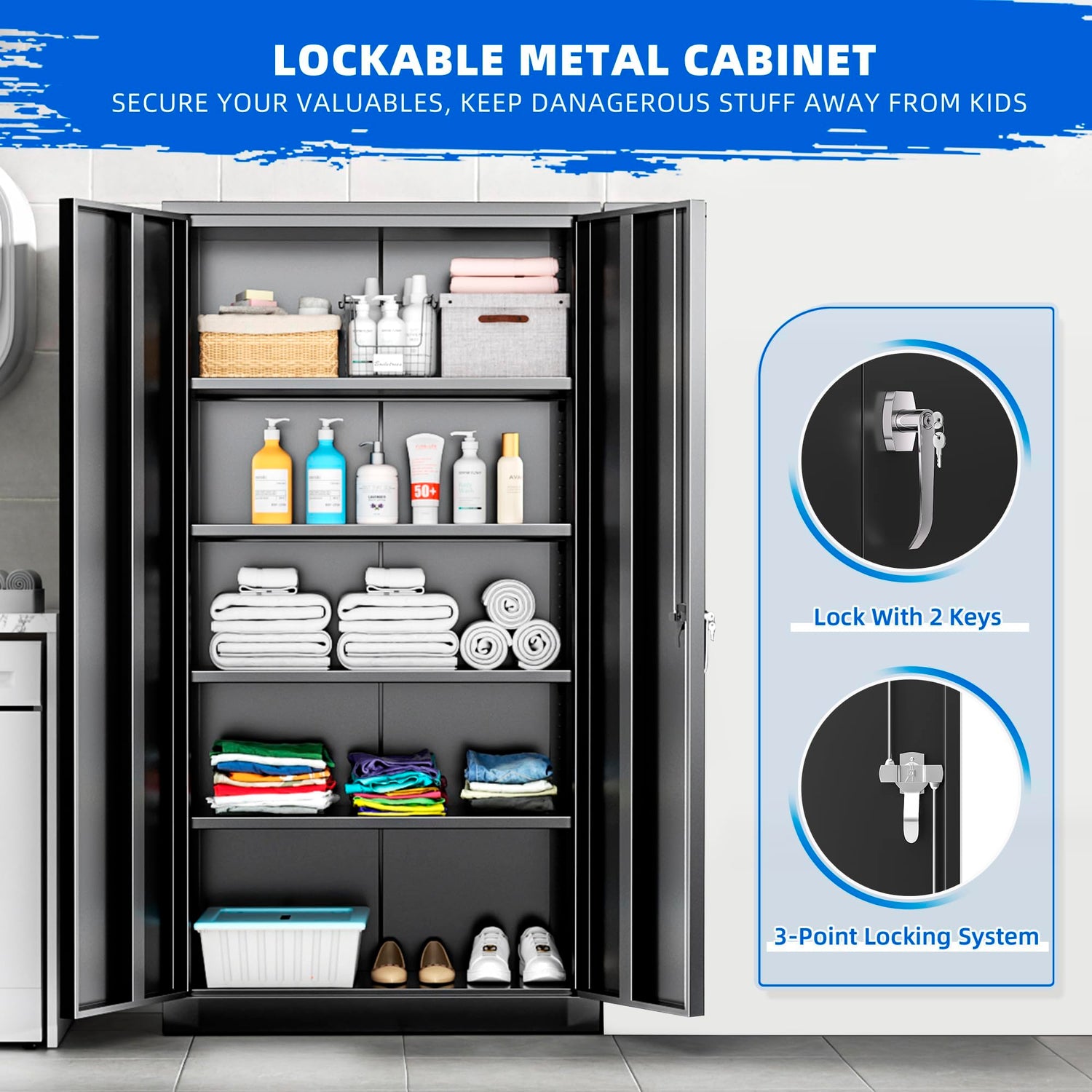 - 🗄️【Optimize Lock System】: This lockable storage cabinet has a three point locking system and comes with two keys for better storage of your important files and personal belongings. Benefiting from the second key, it can be used by co-owners or as a backup in case of loss.