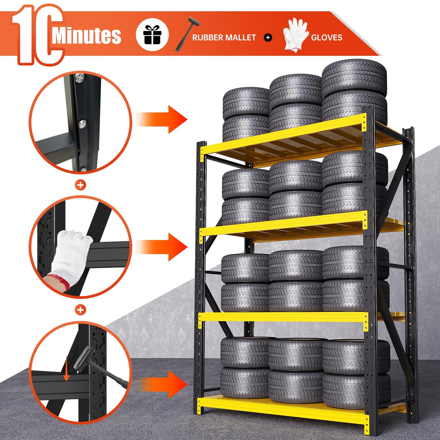 • 【Extra-Large Storage Space to Meet All Your Storage Needs】 This garage shelving unit measures 59“ W x 20” D x 79" H, making it ideal for storage large tools and items. The 4-tier garage storage design maximizes storage space, allowing you to find the perfect spot for everything from large toolboxes and tires to various garage items. The 4 tier shelf storage system allows for effective compartmentalization and organization of different items, while the open design facilitates easy access to your belongings, Metal shelves meet your different storage needs.