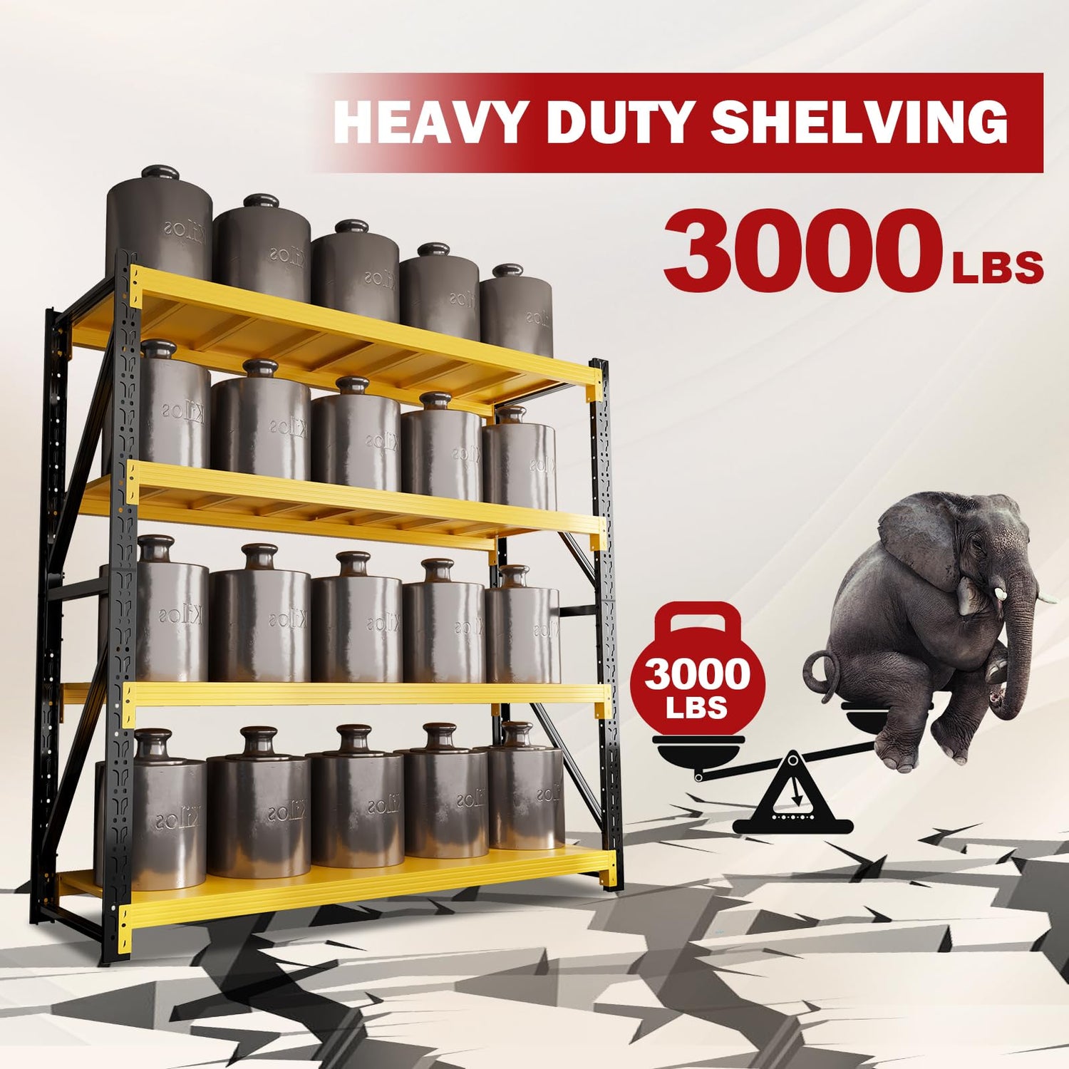 • 【Extra-Large Storage Space to Meet All Your Storage Needs】 This garage shelving unit measures 59“ W x 24” D x 79" H, making it ideal for storage large tools and items. The 4-tier garage storage design maximizes storage space, allowing you to find the perfect spot for everything from large toolboxes and tires to various garage items. The 4 tier shelf storage system allows for effective compartmentalization and organization of different items, while the open design facilitates easy access to your belongings, Metal shelves meet your different storage needs.