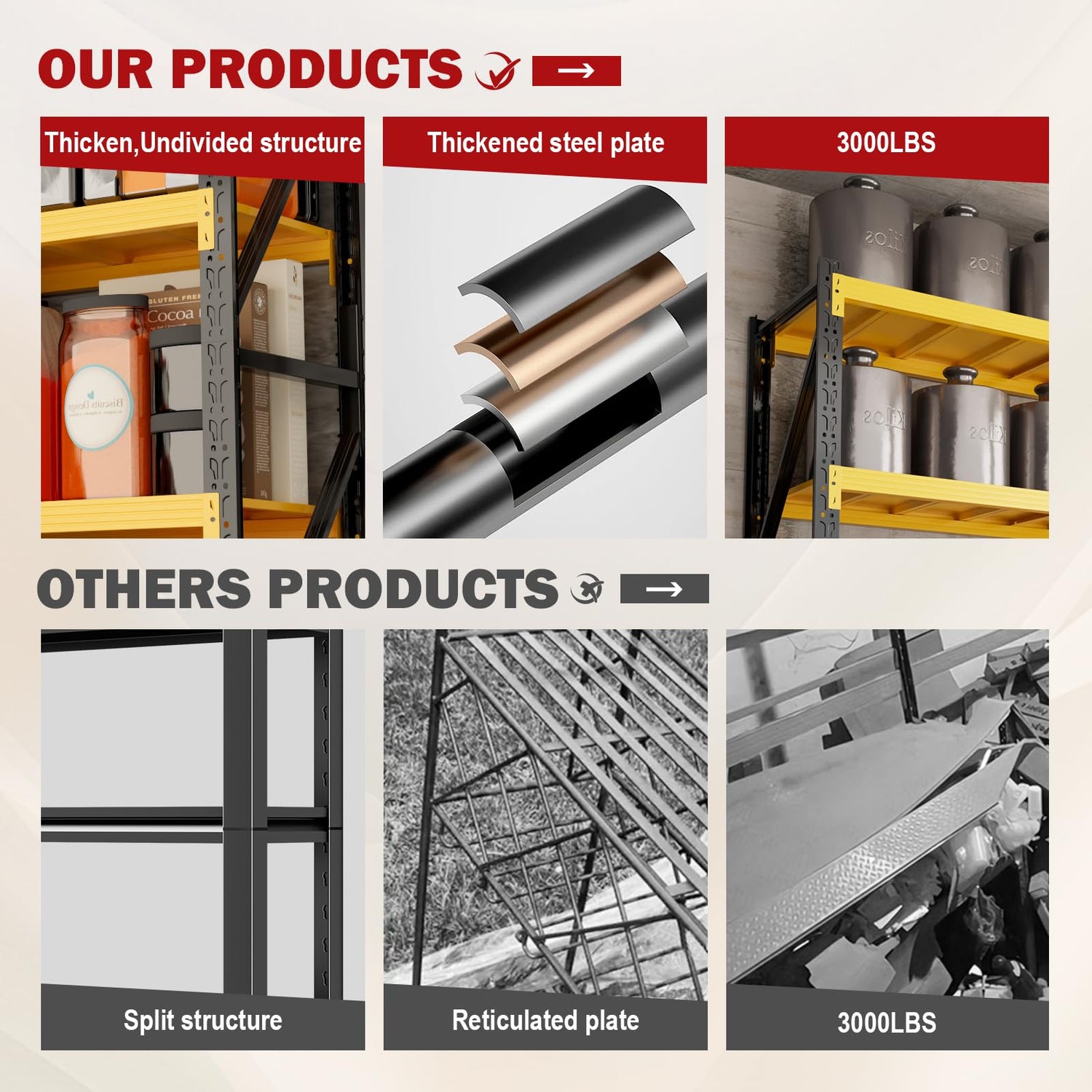 • 【Storage Shelves Heavy Duty with Exceptional Load-Bearing Capacity】The heavy-duty garage shelving is constructed entirely from high-quality metal materials, featuring reinforced and thickened columns. The back of the thickened shelves is further supported by multiple reinforcing ribs, enabling the metal shelving system to achieve a total load-bearing capacity of up to 5,000 lbs. The unique triangular column design significantly enhances the load-bearing capacity of the metal shelves, offering both ample storage space and robust load-bearing capability. Very suitable for use in garage storage, the heavier the load, the more stable the shelves.