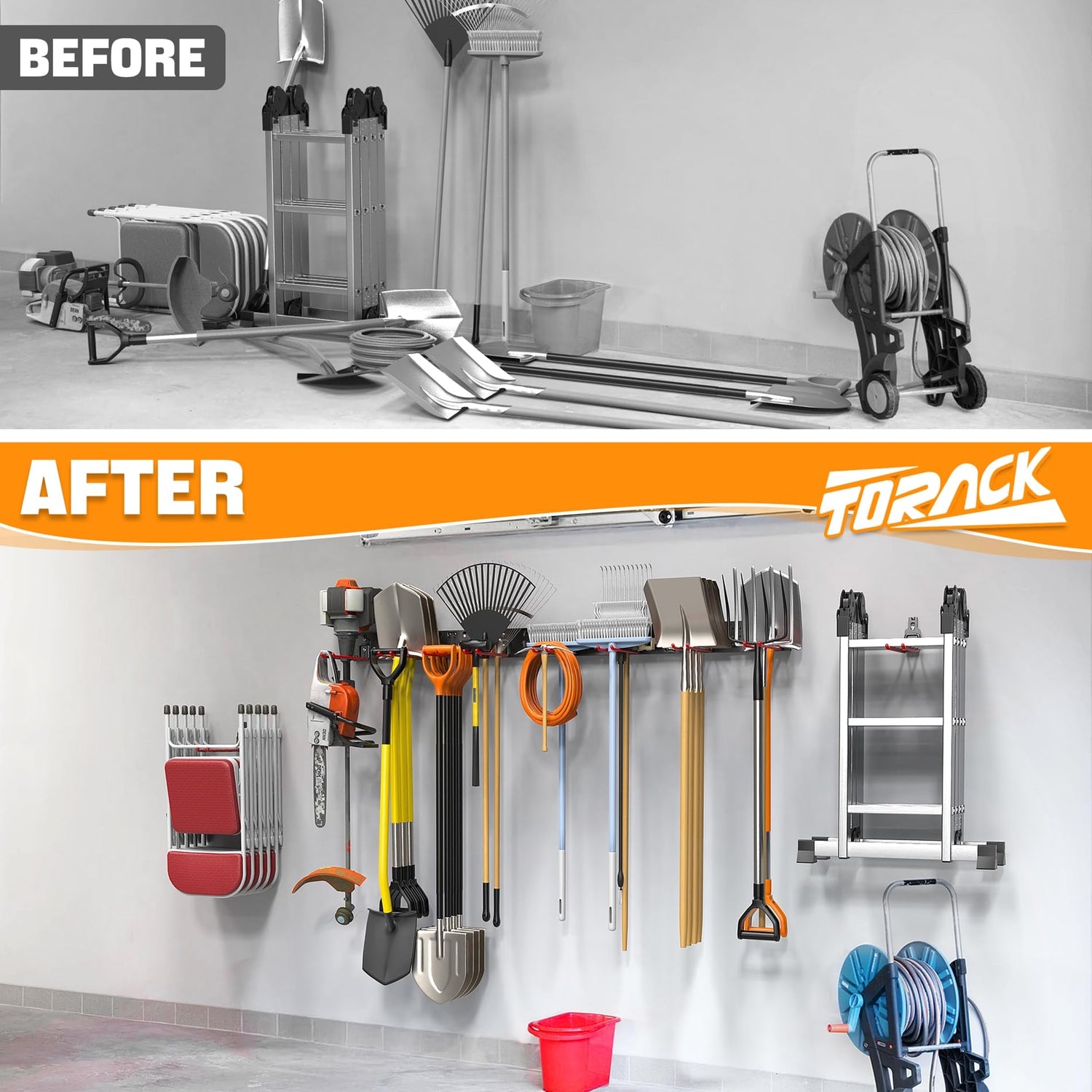 TORACK Garden Tool Organizer Wall Mount, Garage Folding Chair Storage Rack, Tools Rack for Shovels, Rakes, Broom, Ladders, Hooks for Keyhole Style Shelving Unit