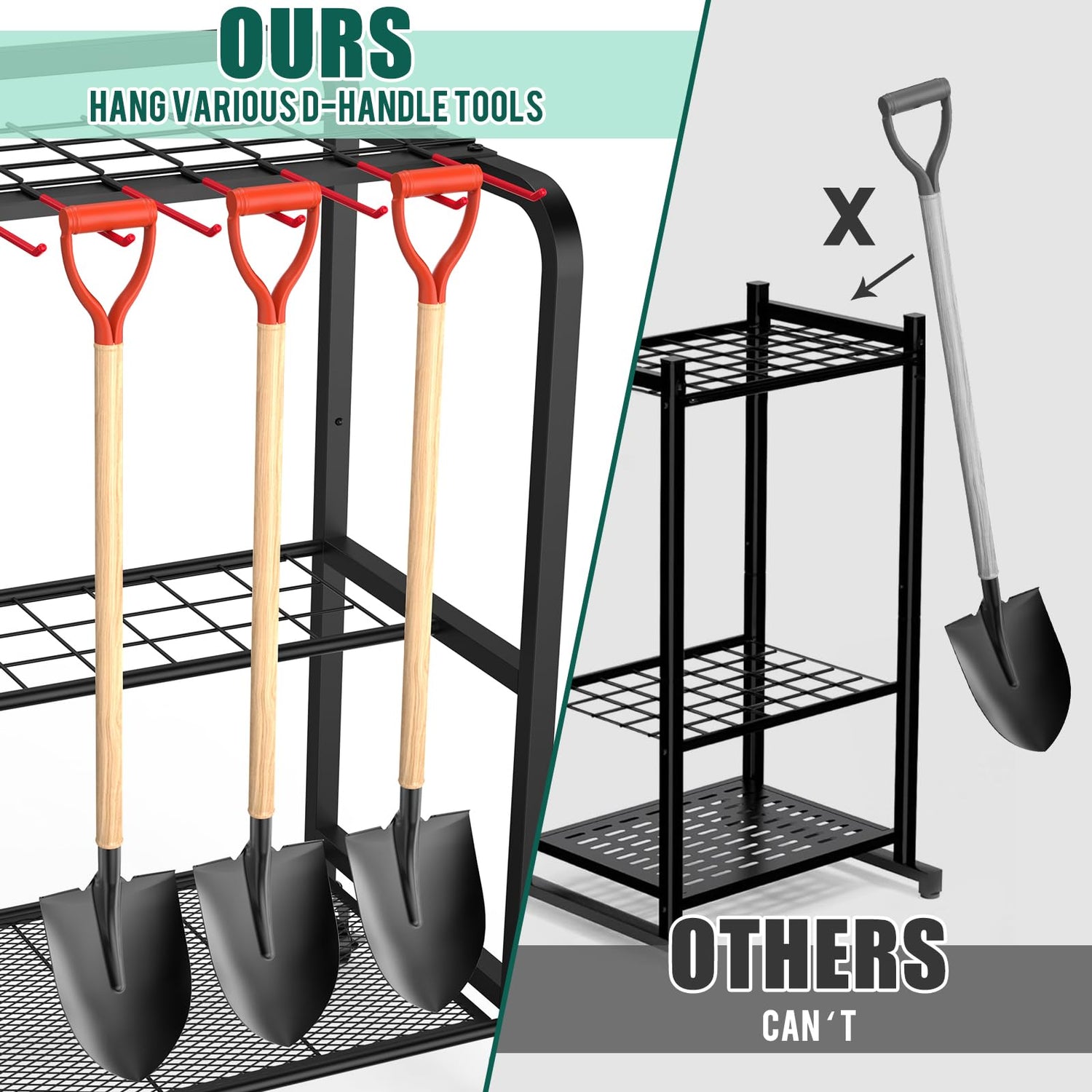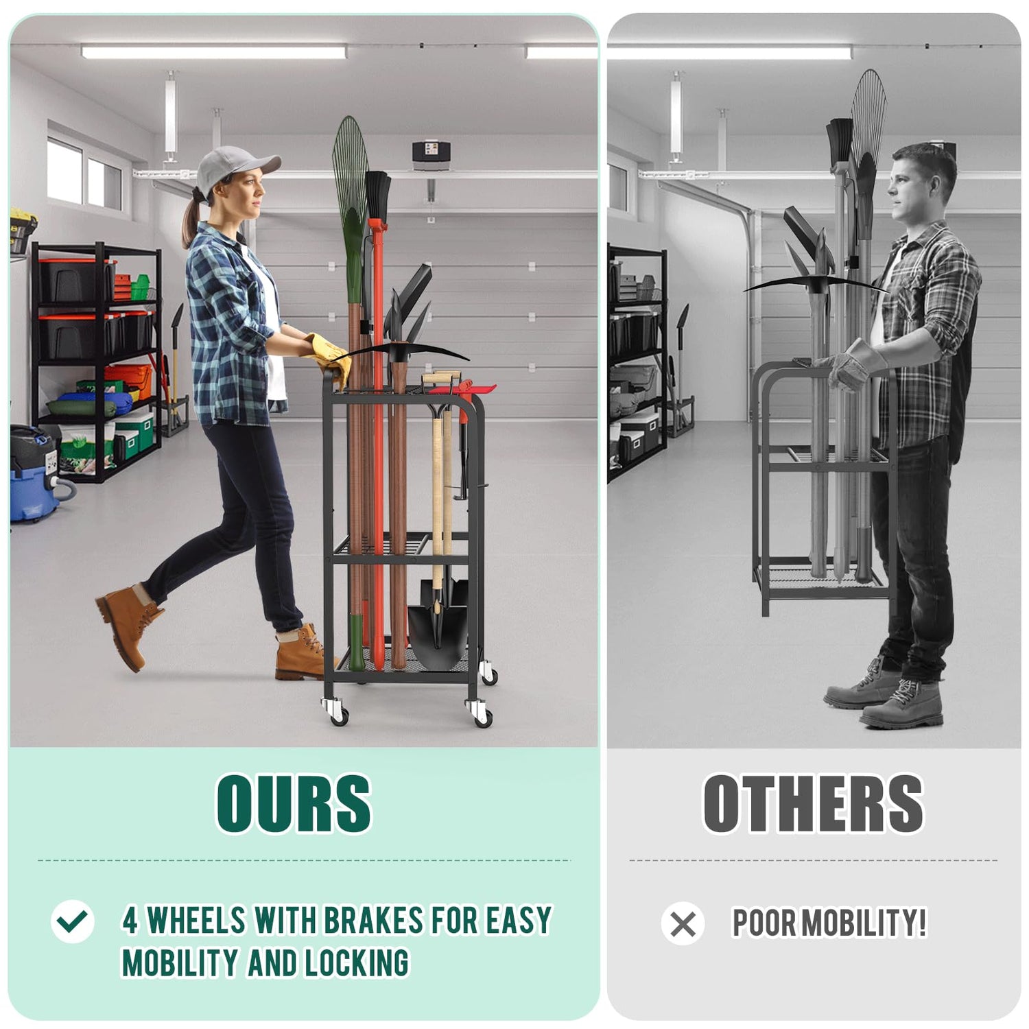 - Use Various Case: The purpose of producing the garden tool organizer is to store garden, yard and lawn tools, so it can store but not limited to broom, mop, rake, tongs, shovels and other tools, because it carries wheels, so it can be easily applied to the garage, garden, shed and backyard, using it can make the whole space more orderly and tidy, look less cluttered. Not only does it feel comfortable but it also improves space utilization.