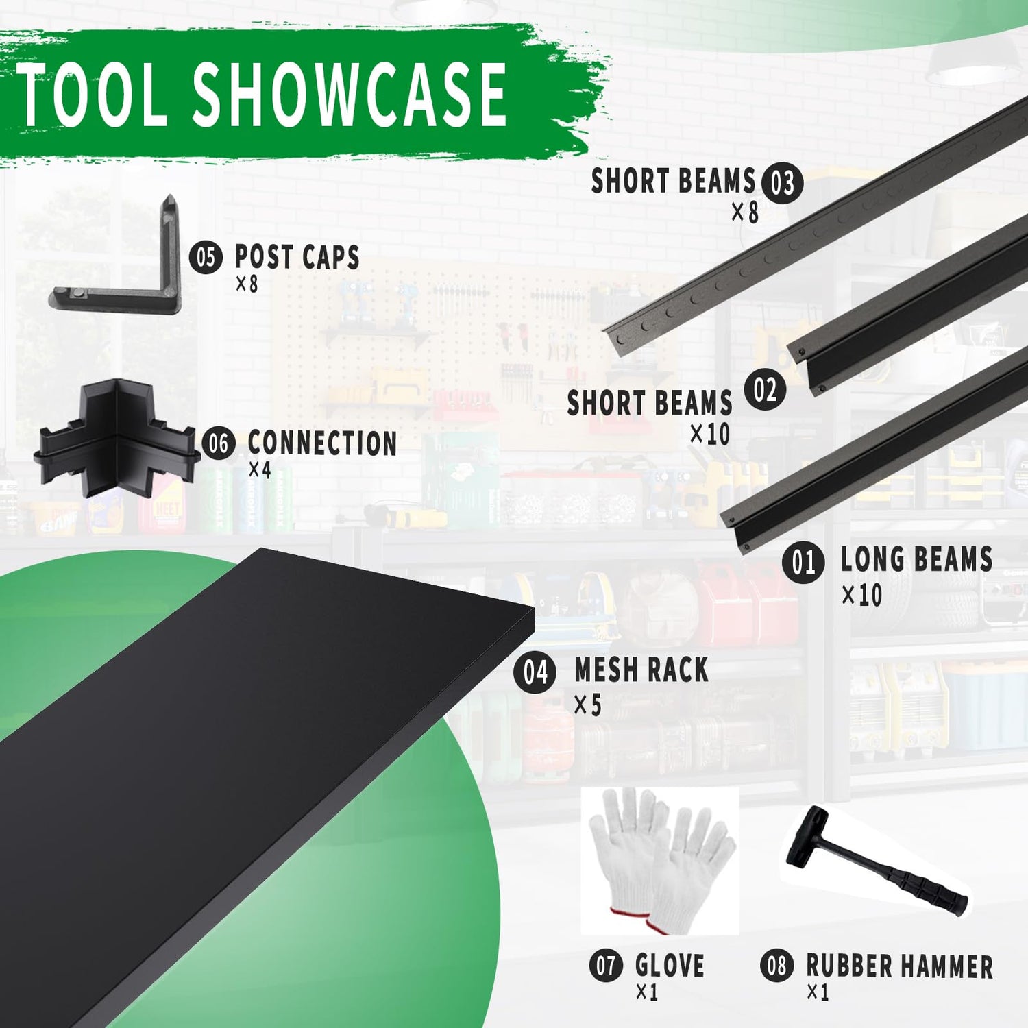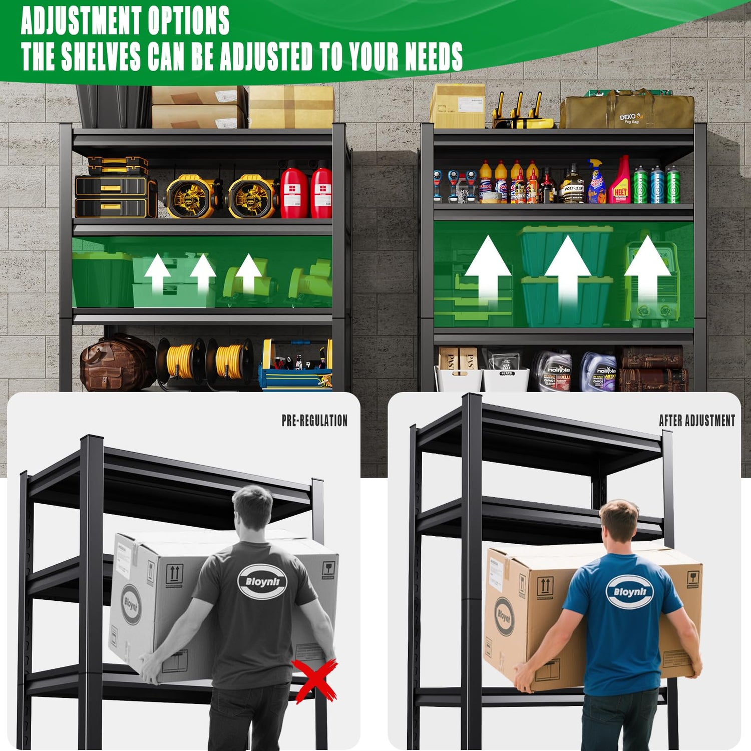 - Flexible Adjustment,Customized Storage Space: You can freely adjust the height of each shelf according to the actual size and type of stored items.this flexible design allows you to make the most of the vertical space.Whether it's large - sized items like tires and automotive parts, or small gardening tools and toolboxes, you can find a suitable storage position, achieving personalized customization of the storage space and making garage storage more efficient and organized.Say goodbye to clutter and hello to a tidy, organized space where you can actually find your stuff!