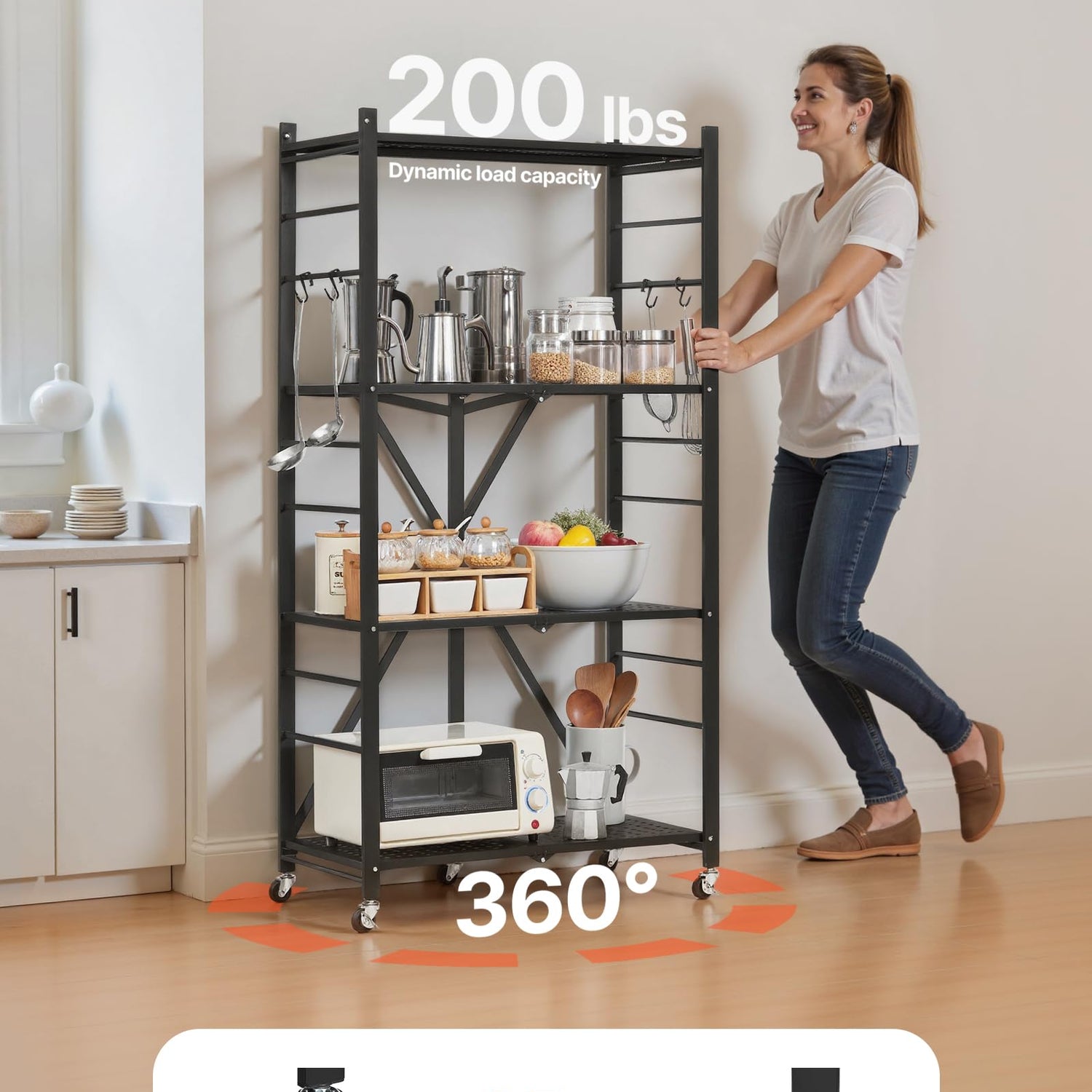 - Easy Mobility: With 5 swivel wheels (2 with brakes), this folding shelf moves effortlessly on tiles, cement, and epoxy floors. The 360° rotation solves the old “stuck shelf” problem, supporting up to 200 lbs.