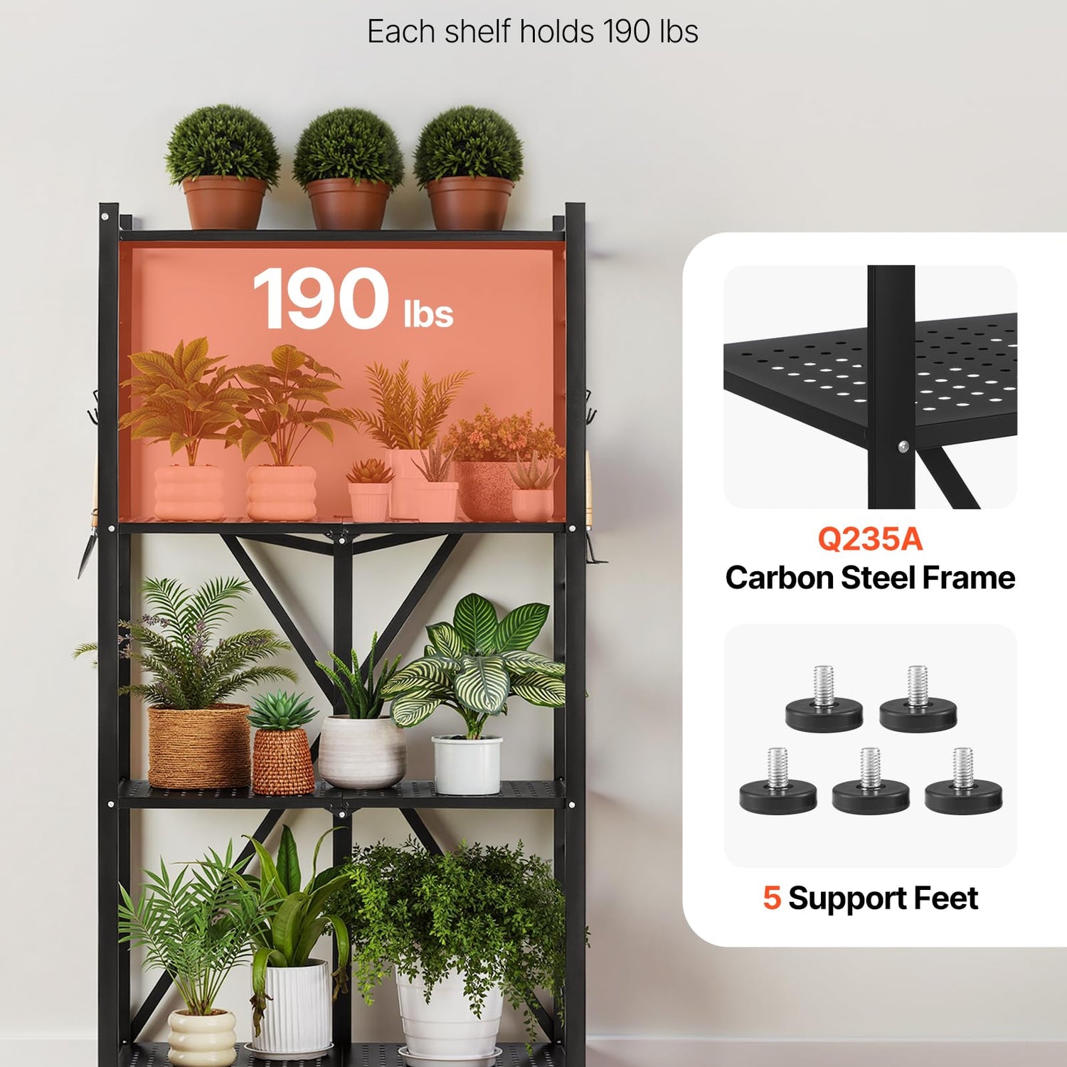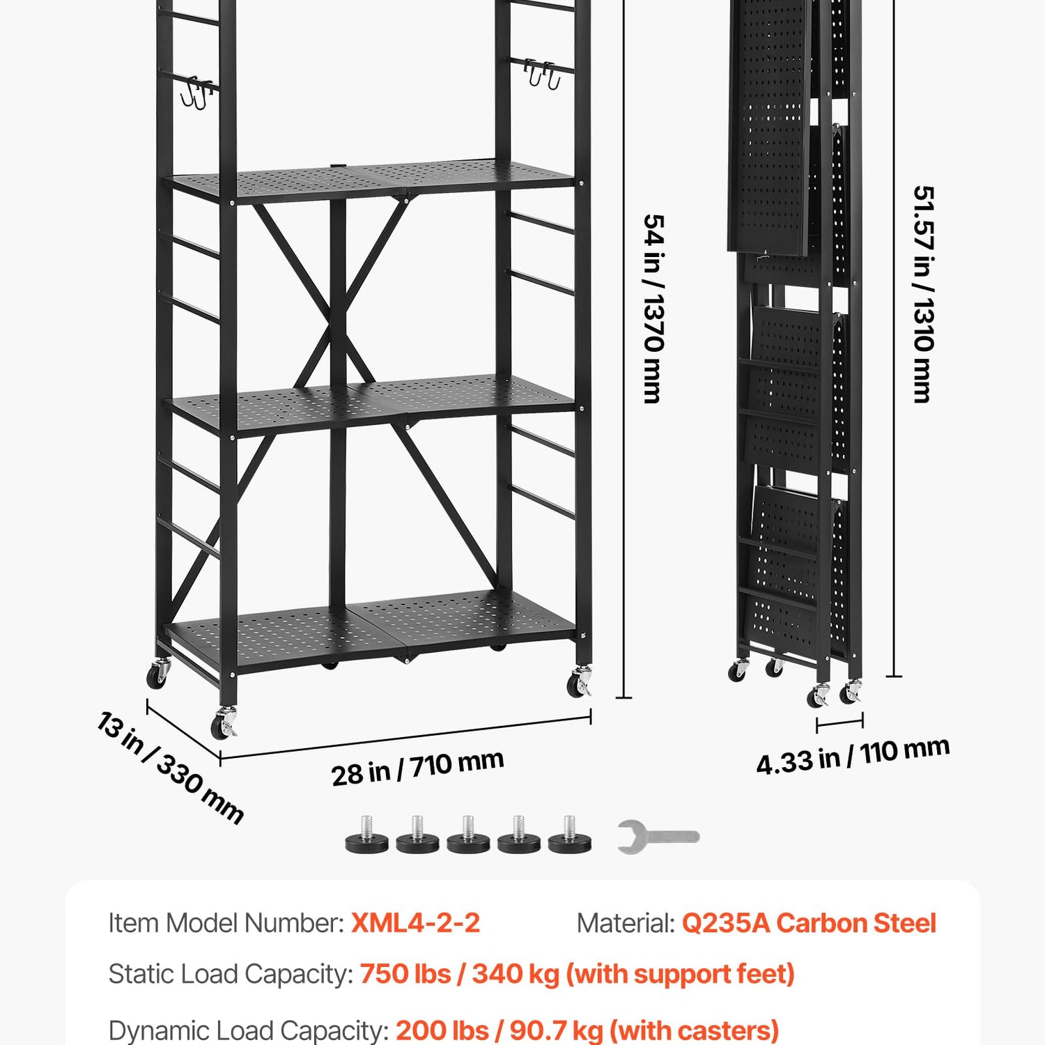 - Sturdy and Secure: The Q235A carbon steel frame of the folding shelving unit holds up to 190 lbs per layer. Detachable support feet bring a static load capacity of 750 lbs. Plus, the crossbar keeps everything from slipping. Organize with ease!