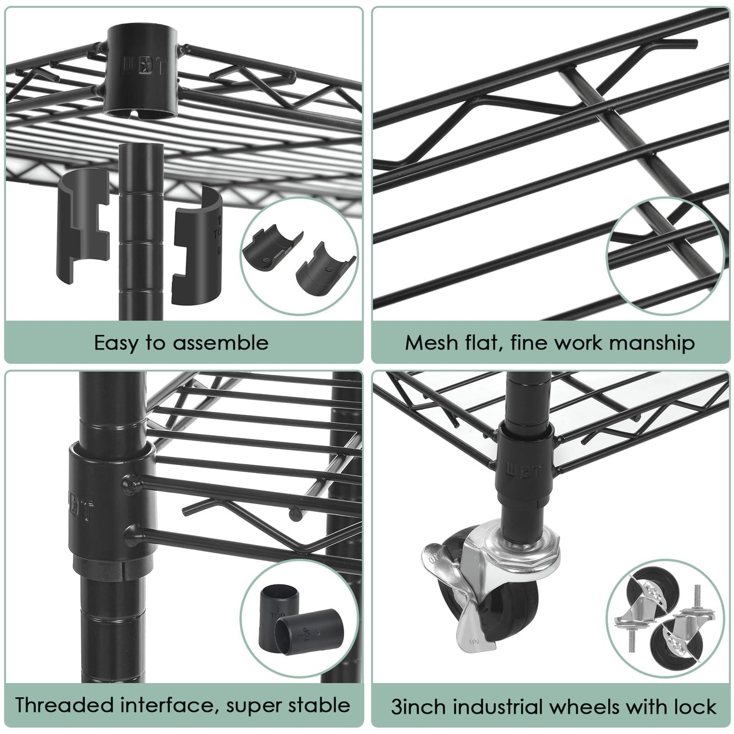 - 【Storage Racks With Wheels】The metal storage shelves are equipped with 4 industry 3” wheels, include 2 fixed locks that can be fixed or moved at any time. For example, you can unlock when you need to push the metal wire shelving clean or push it into a sunny place. If you want to secure the heavy metal rack in place, you can lock the wheels.