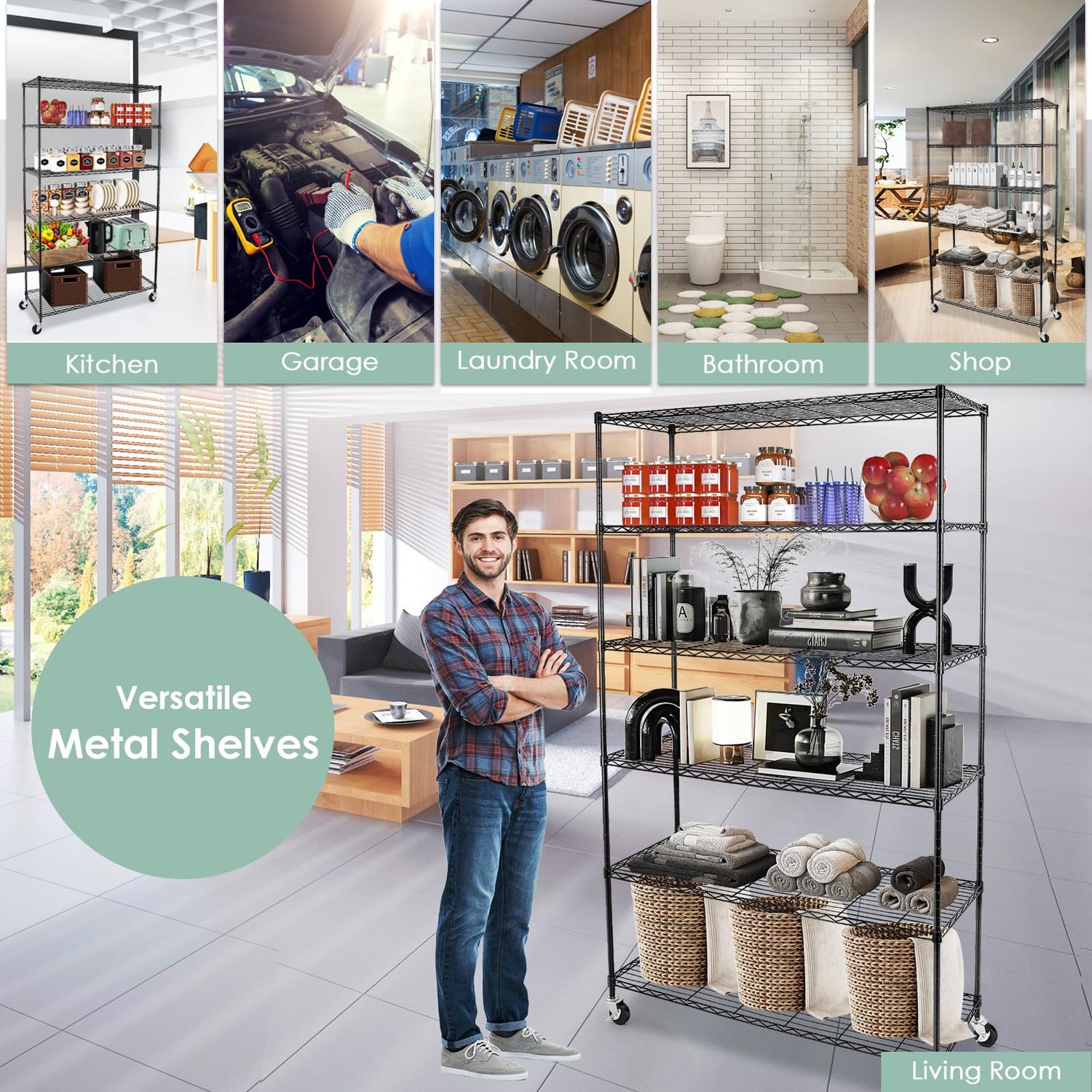 - 【Premium Quality 6 Tier Large Storage Shelves】Durable metal construction with black-coated finish, make it has excellent rust resistance and oxidation resistance.6-Tier shelving unit with leveling feet size 17”Wx47”Dx77”H, with wheels size 17”Wx47”Dx80”H. This shelving have huge storage space. Tools,,books,clothes,kitchen supplies or anything you'd like to keep organized can be placed on this storage shelves. Our metal shelves doesn't occupy too much space, but create more space.