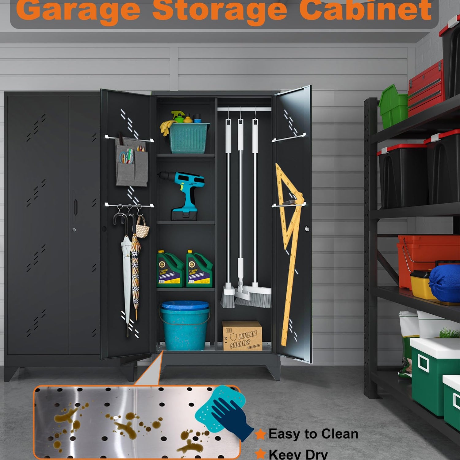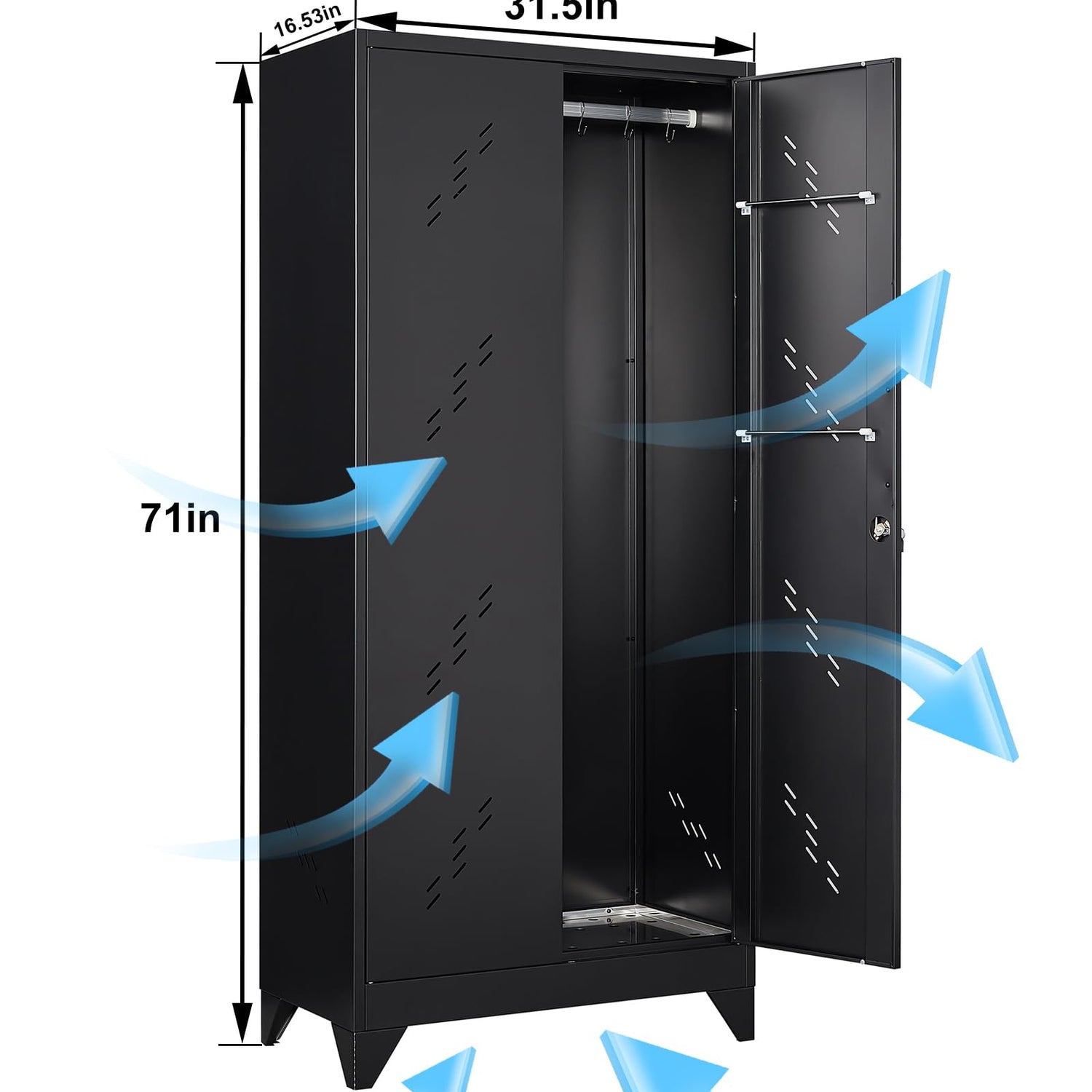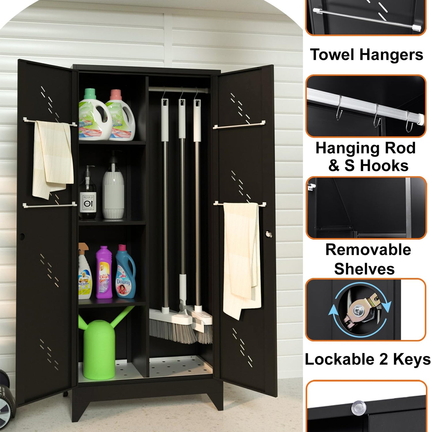 YILFANA Metal Storage Cabinet with Lock, 71" Garage Storage Cabinet with Hanging Rod & S-Hooks, Large Storage Cabinet, Locking Tool Cabinet Utility Closet, Black