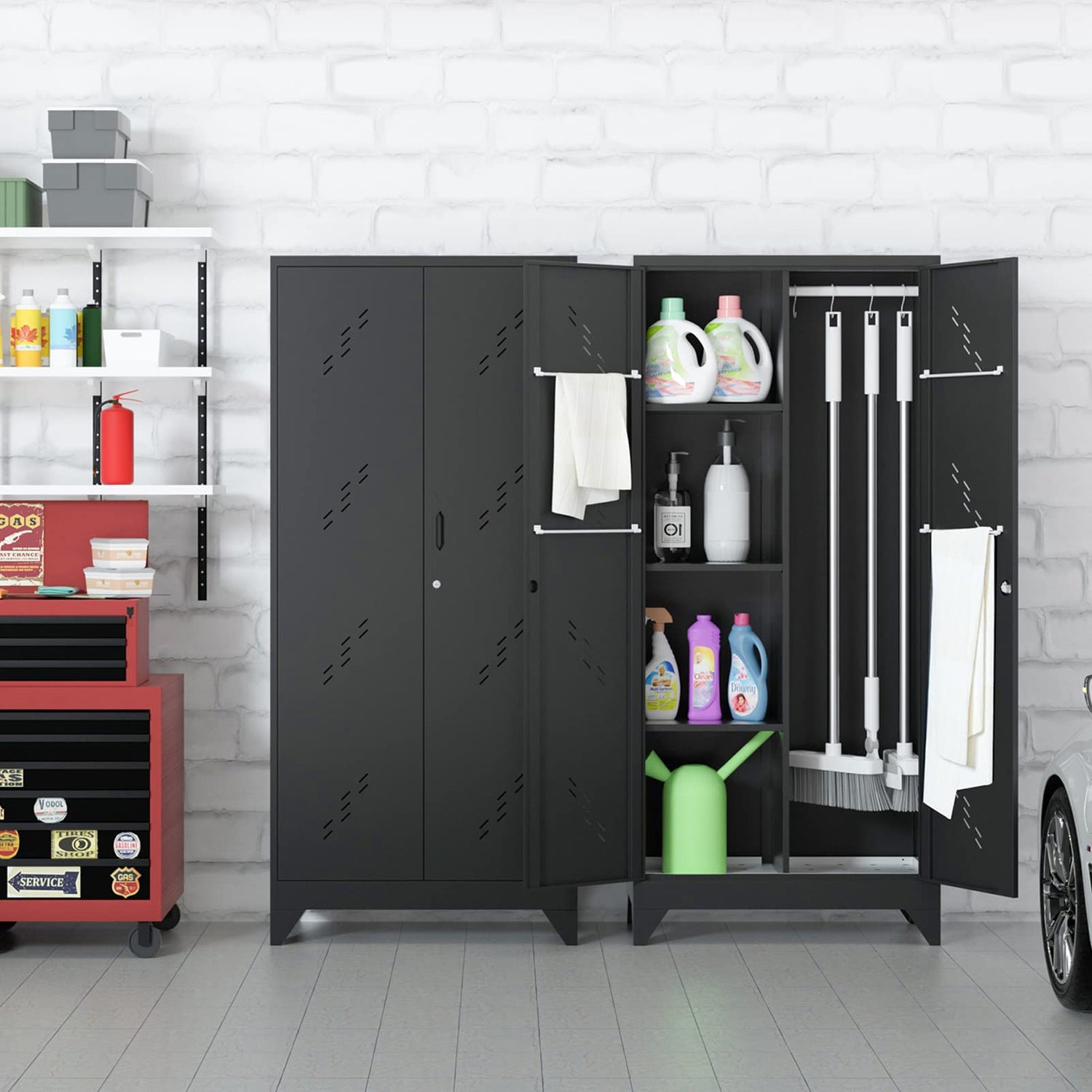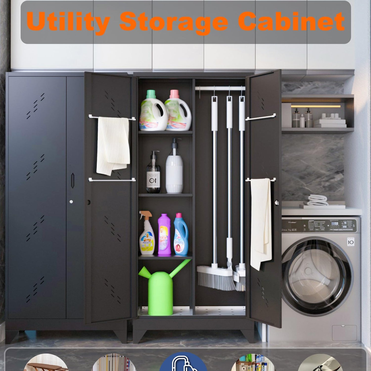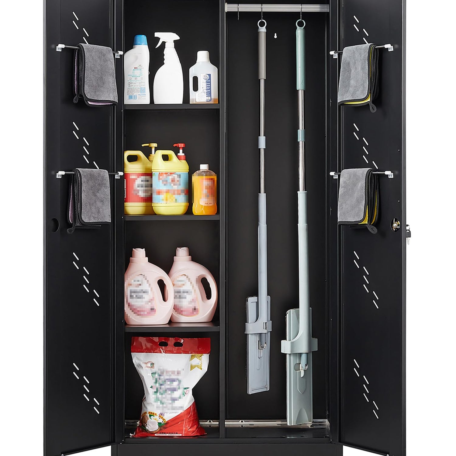YILFANA Metal Storage Cabinet with Lock, 71" Garage Storage Cabinet with Hanging Rod & S-Hooks, Large Storage Cabinet, Locking Tool Cabinet Utility Closet, Black