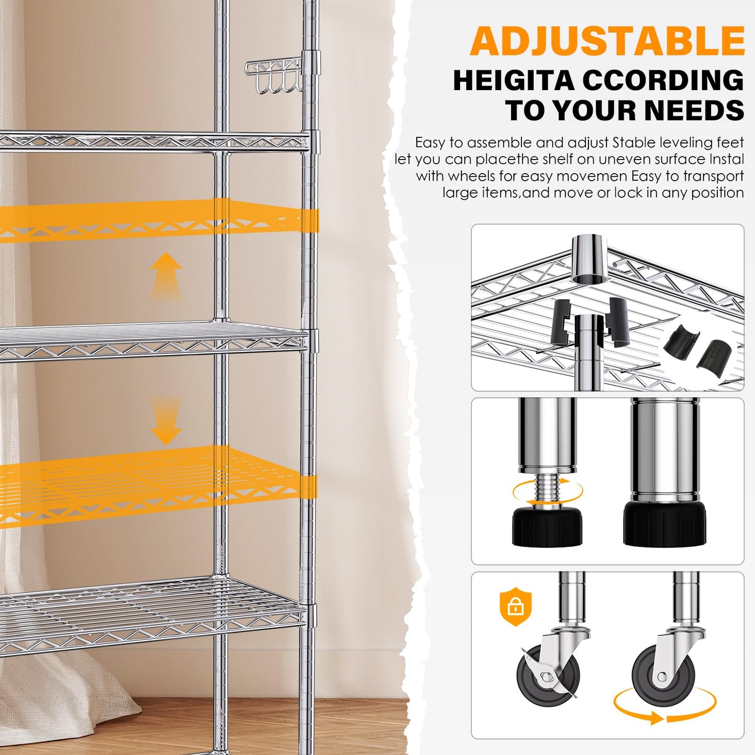 YNN Storage Shelves,1750Lbs 5 Tier Heavy Duty Metal Rolling Shelving Unit with Wheels & 8 Hooks, Adjustable Garage Wire Rack for Kitchen, Bathroom,Industrial,Pantry(36" W x 14" D x 72" H, Chrome)