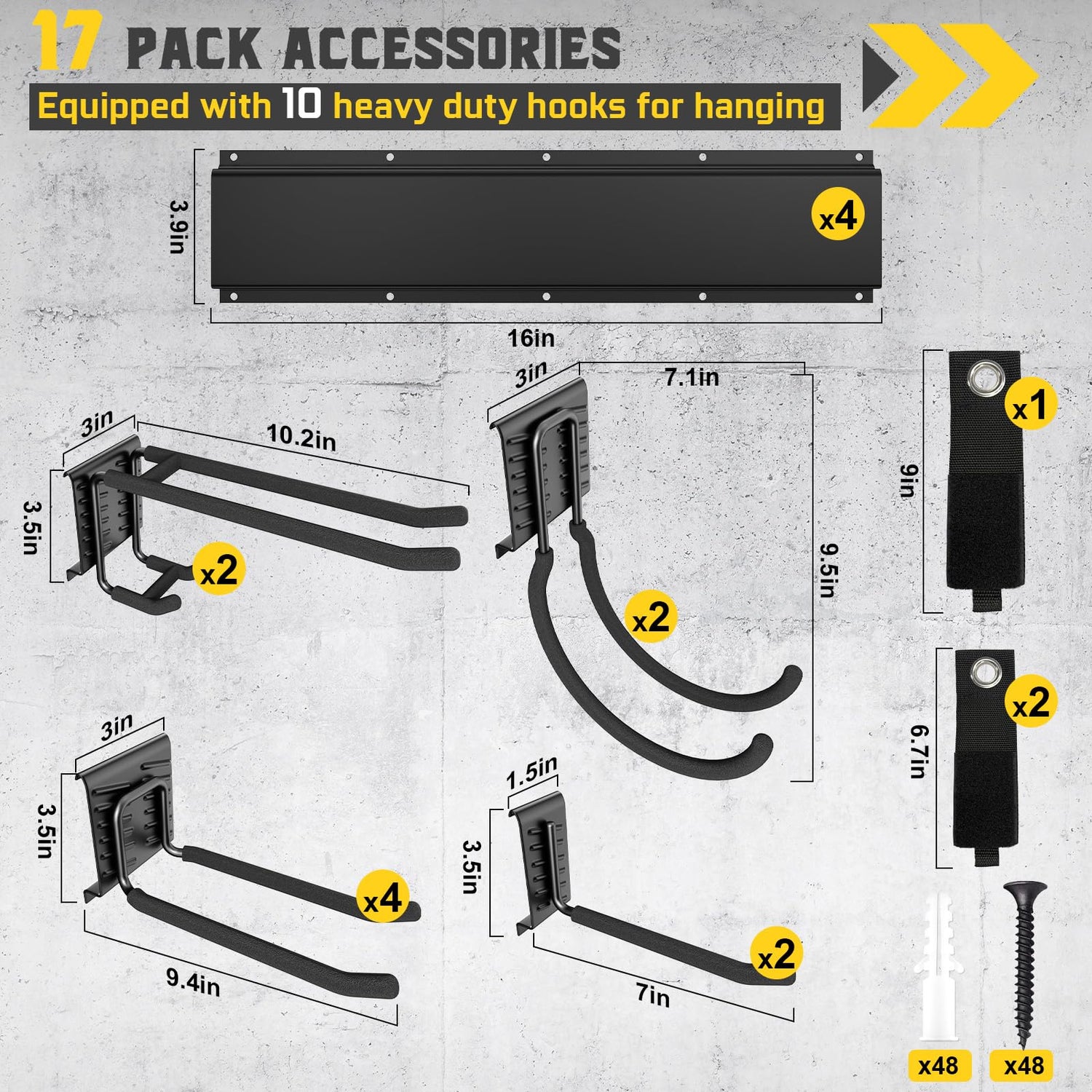 - Maximizing Space Utilization: The 64" garage organizer equipped with 4 racks, 10 Hooks(6 double lower hooks, 2 double layer hooks, 2 single hooks) and 3 Straps. On the racks, the hooks can be adjust place for various hanging needs