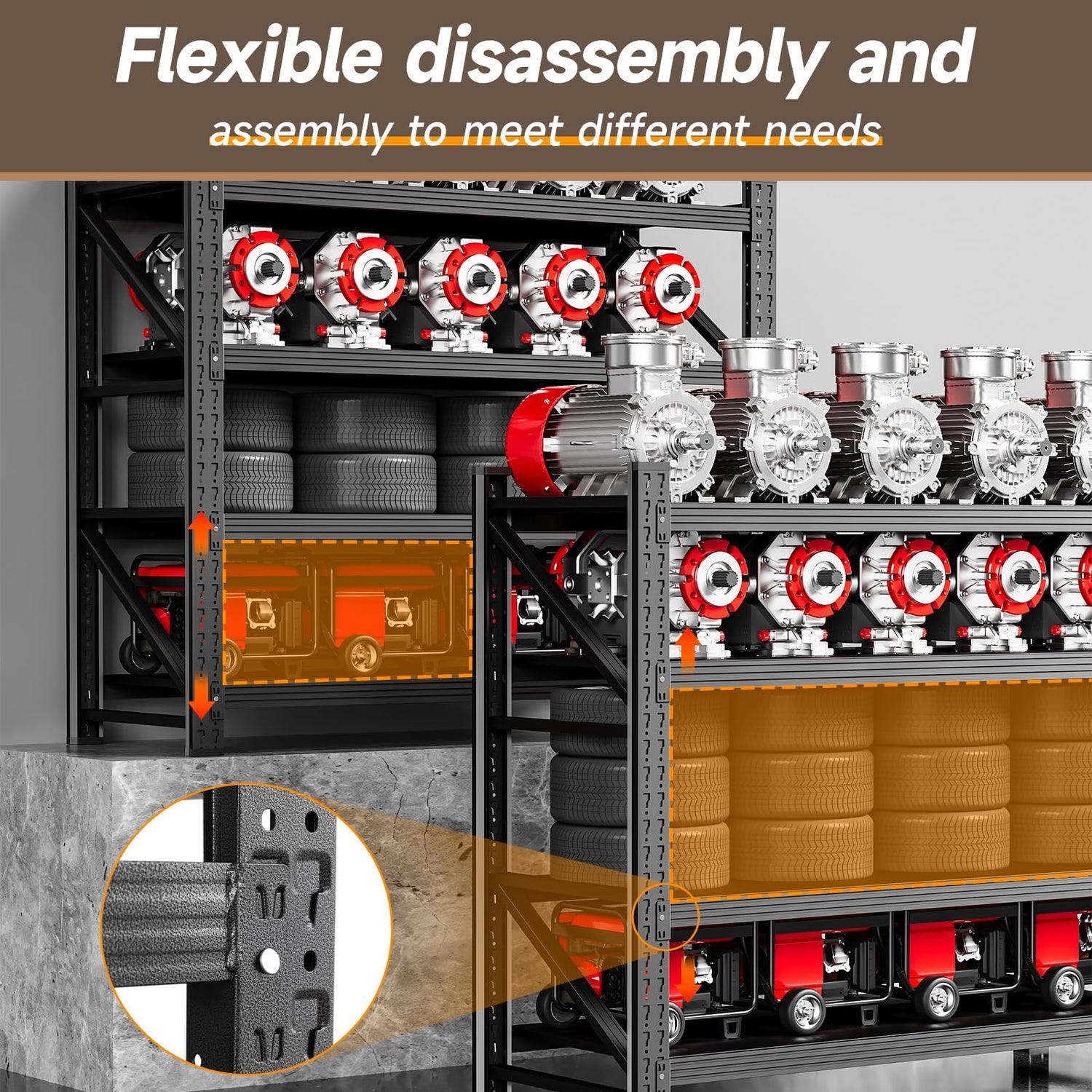 - 【High-quality Materials】Our heavy-duty shelves have a total weight capacity of 5000 pounds. To withstand extreme weights, our metal racks feature thickened vertical columns and heavy-duty beams to enhance load-bearing performance. These shelf units and storage are resistant to warping or deformation. The sturdy cold-rolled steel structure ensures reliable use for many years in garage storage shelves or commercial storage environments.