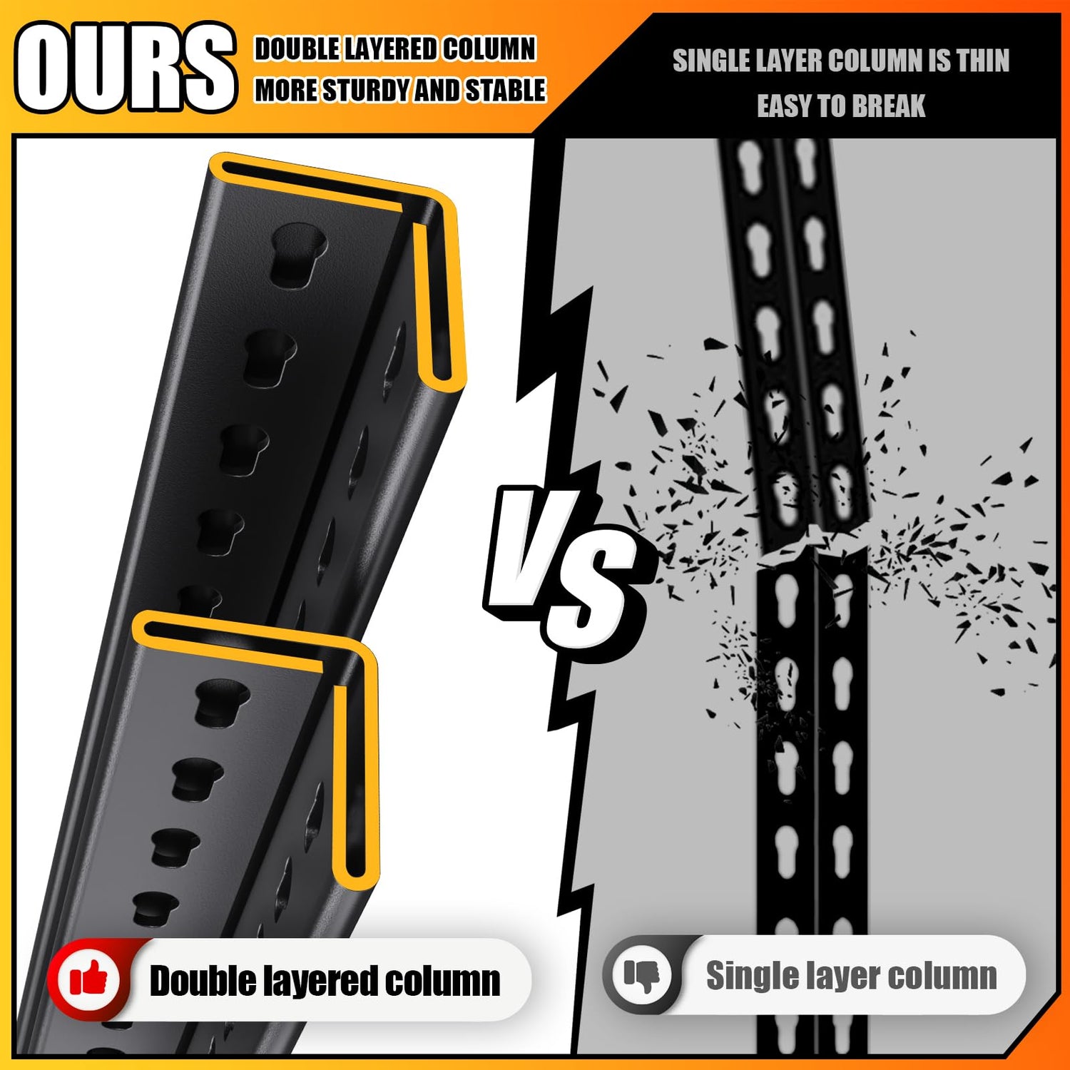 - 【High-quality metal】 Our garage shelving are made of high-quality heavy-duty steel and feature a scientific mechanical structure design that evenly distributes load pressure and provides extremely high durability. The double-layer widened columns provide superior stability, eliminating the risk of damage and collapse associated with single-layer designs. The upgraded storage shelves can hold up to 2,500 pounds, allowing you to safely organize all kinds of tools, equipment, and gear.