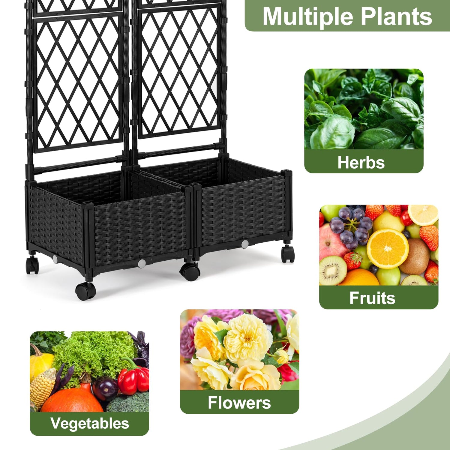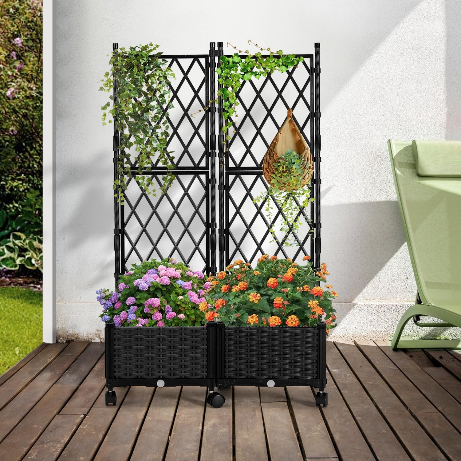 FOLLOOK Planter Box with Trellis, 4ft Tall Self-Watering Plastic Raised Garden Beds and Lattice Trellis with Lockable Wheels & Drain Plug for Outdoor Patio Backyard Balcony, Black, 2 Pcs