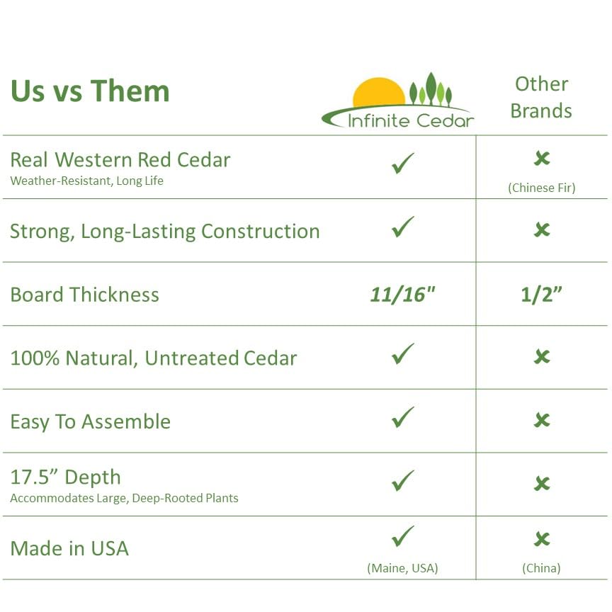 Details: Infinite Cedar's Select Cedar Raised Garden Bed Kits are made in the USA from 100% natural Western Red Cedar, which is a durable and naturally weather-resistant wood. The garden beds are sturdy and easy to assemble, with strong corners that are built to last and won't tear out like dovetail construction corners do. They can be stained or left unfinished to age naturally. The raised garden beds are made from thick "1x4" cedar boards that measure 11/16" thick and 3.5" tall, providing superior strength and durability. The boards are also smooth on one side, making them easy to clean and maintain. Whether you are a seasoned gardener or just starting, these raised garden beds are a great way to create a beautiful and healthy garden.
