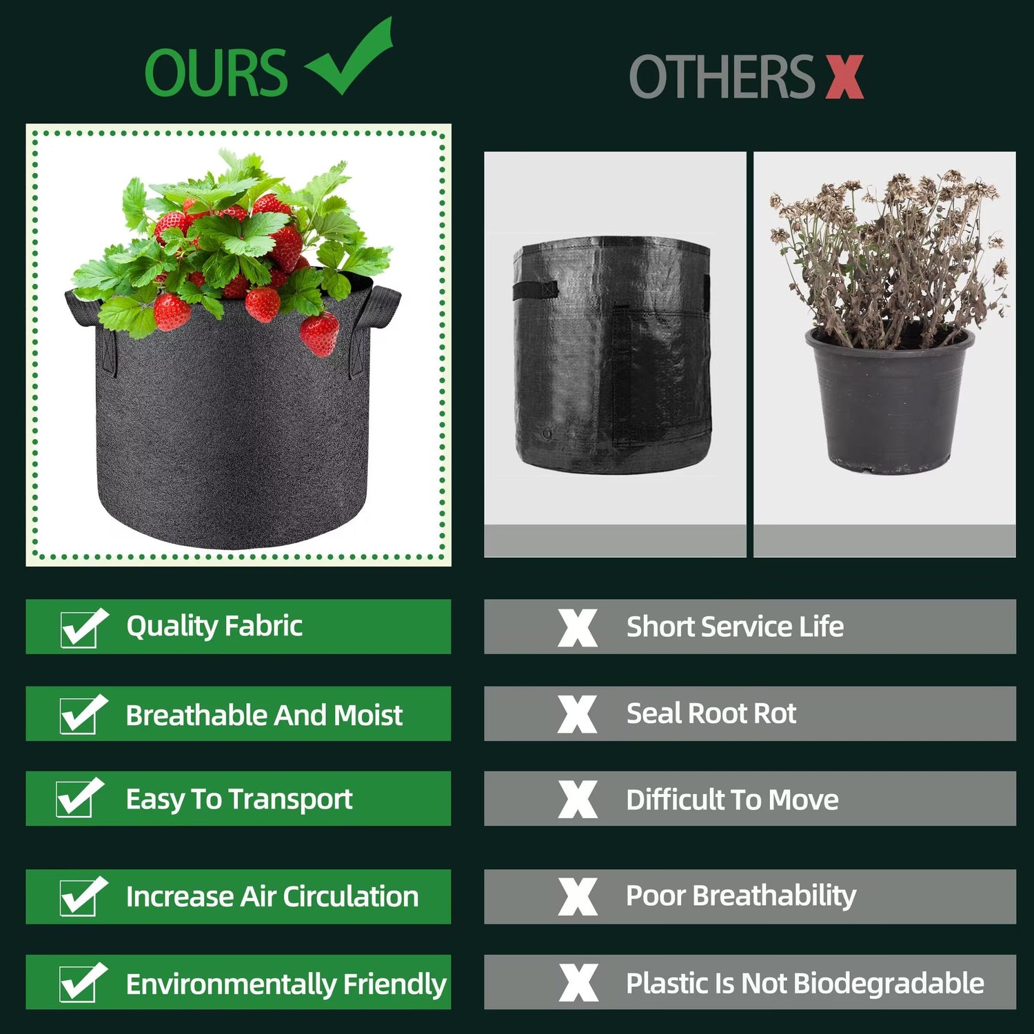 - 【Green, Environmentally Friendly,Sustainable Use】 Non-woven felt Garden Fabric pots can be reused for several growing seasons for many years. Compared with plastic planting pots, air-permeable and water-permeable felt Plant Grow Bags can better protect the roots of plants, save more money and save time