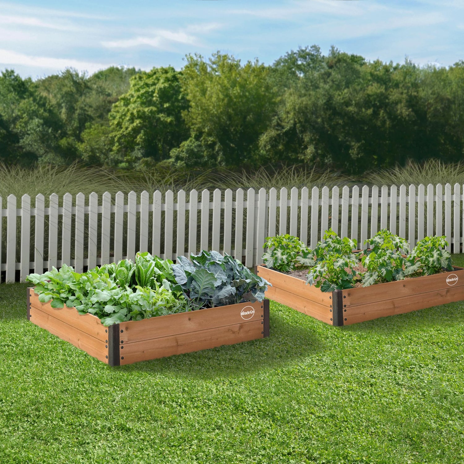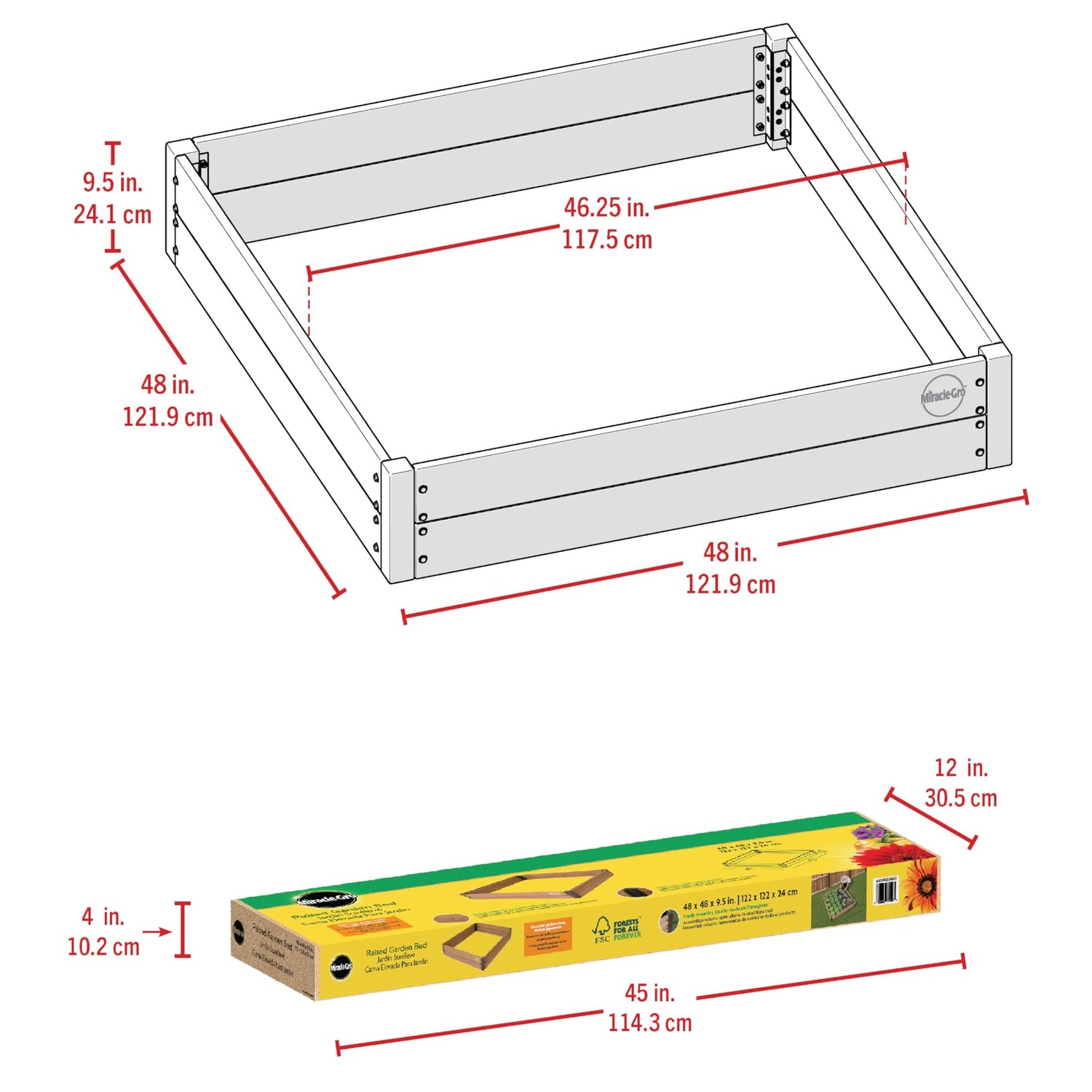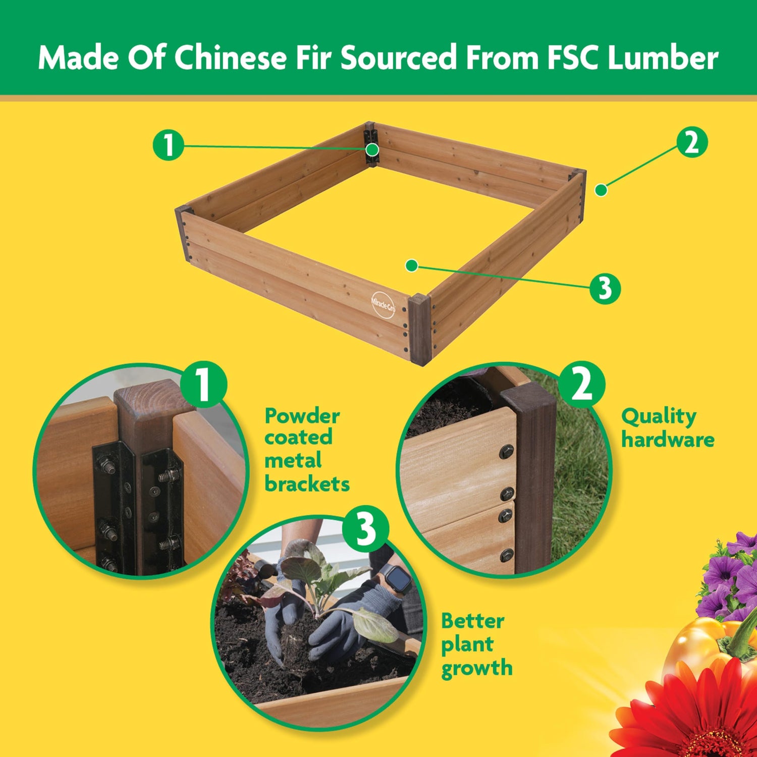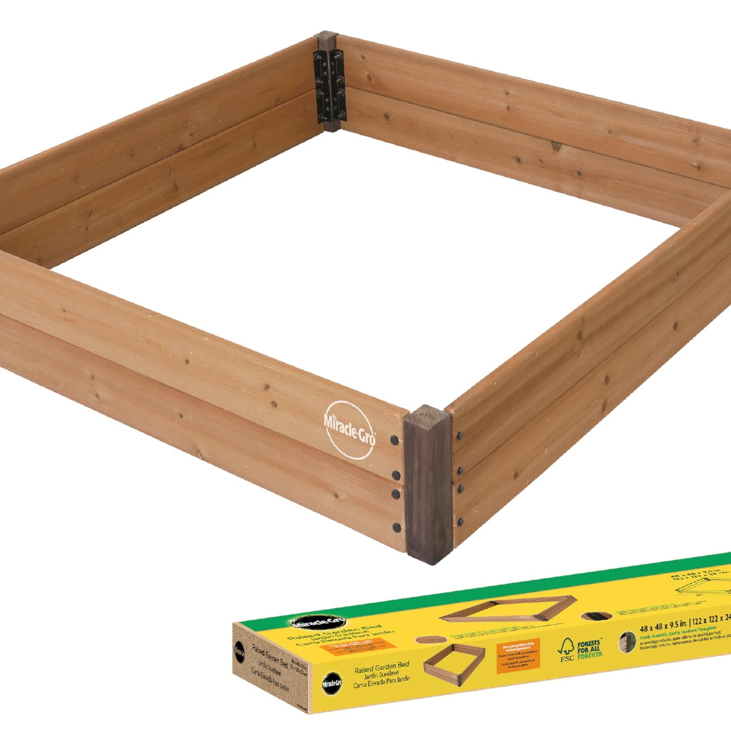 Details: Create a thriving garden almost anywhere with the Miracle-Gro 4 x 4 Ft. Raised Garden Bed. Designed for convenience and long-term performance, this raised garden planter is constructed from Chinese Fir wood sourced from responsibly managed FSC forests. Naturally resistant to water, aging, and decay, the fir lumber provides reliable durability while offering a warm, natural aesthetic that complements any outdoor space. With a planting depth of 9.5 inches and a total soil capacity of 12.8 cubic feet, this raised gardening bed gives you ample room to grow a wide range of herbs, vegetables, or flowers, perfect for both new gardeners and seasoned green thumbs. Powder-coated steel corner brackets and sturdy hardware ensure strong structural support and simplified assembly. Ideal for backyards and compact garden areas, the 48" x 48" frame helps maximize space without overwhelming your layout. Whether you're setting up a kitchen herb garden, cultivating seasonal crops, or building a floral display, the Miracle-Gro Raised Garden Bed gives you a stylish and functional foundation built to last season after season.