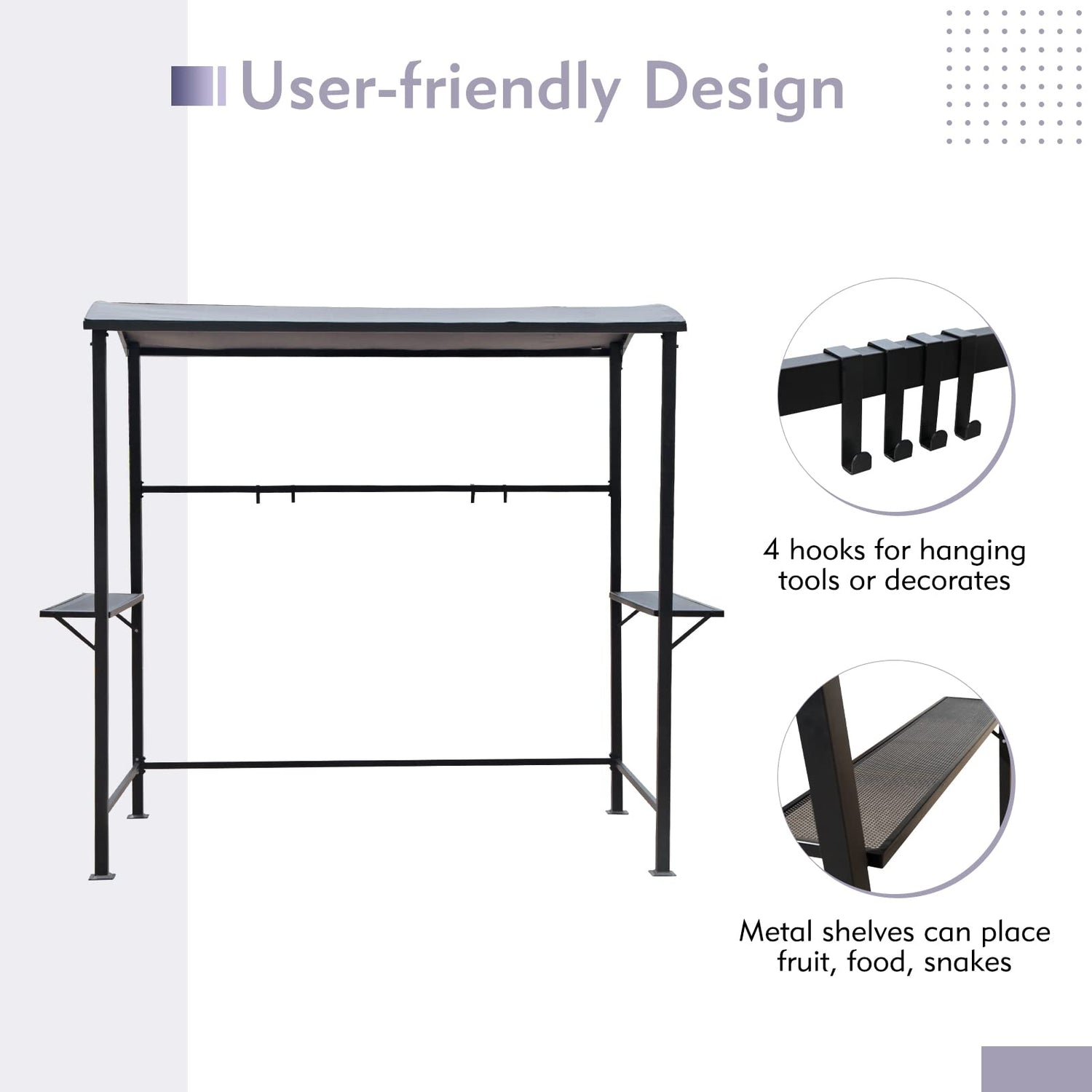 COBANA grill gazebo with multi-function details like extra 4 pothooks, grid metal shelves and poles on top structure for LED accessories can meet your expectation for a practical grill gazebo, and the simple design with three fabric color options can match different backyard styles. The soft fabric is easy to clean before storage, and the archy top can prevent water accumulation in usage. Take it back and enjoy your relaxing time with your friends and families without travel too far from home, just in your patio, in your backyard with delicious BBQ and cool beverage!