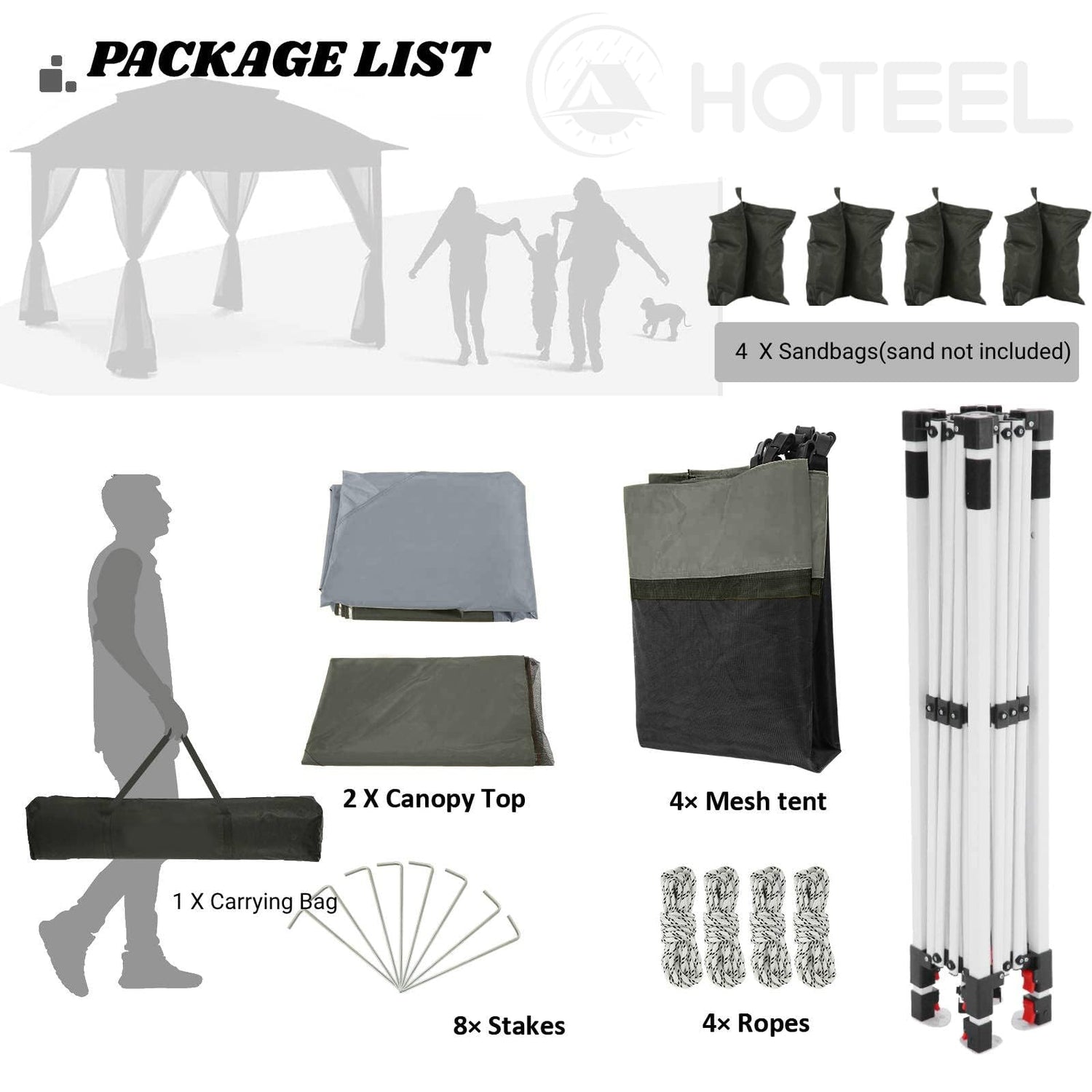 - 【Complete Accessories & Multipul-purpose】What You can get from the package: 1 carry bag, 1 gazebo frame, 2 canopy tops, 1 mosquito netting, 8 stakes, 4 sandbags and 4 ropes. This outdoor gazebo storage bag makes it easy to store in your car trunk or garage. Our backyard gazebo has three heights for you to adjust, allowing you use our gazebo for backyard, patio, camping, parties or wherever you want.