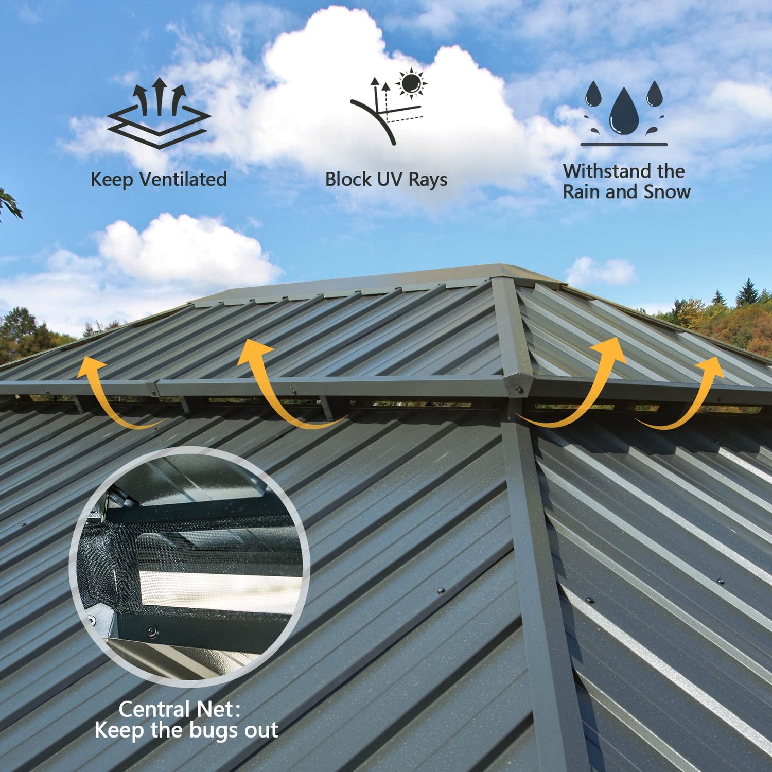 - 【Galvanized Steel Roof】Strong enough to withstand 2500 pounds of heavy snow. The double roof design can increase the ventilation and comfort in this hardtop gazebo 12’ x 16’. Attached net on the top can prevent fallen leaves and the hooks can be used to hang lights or fans.