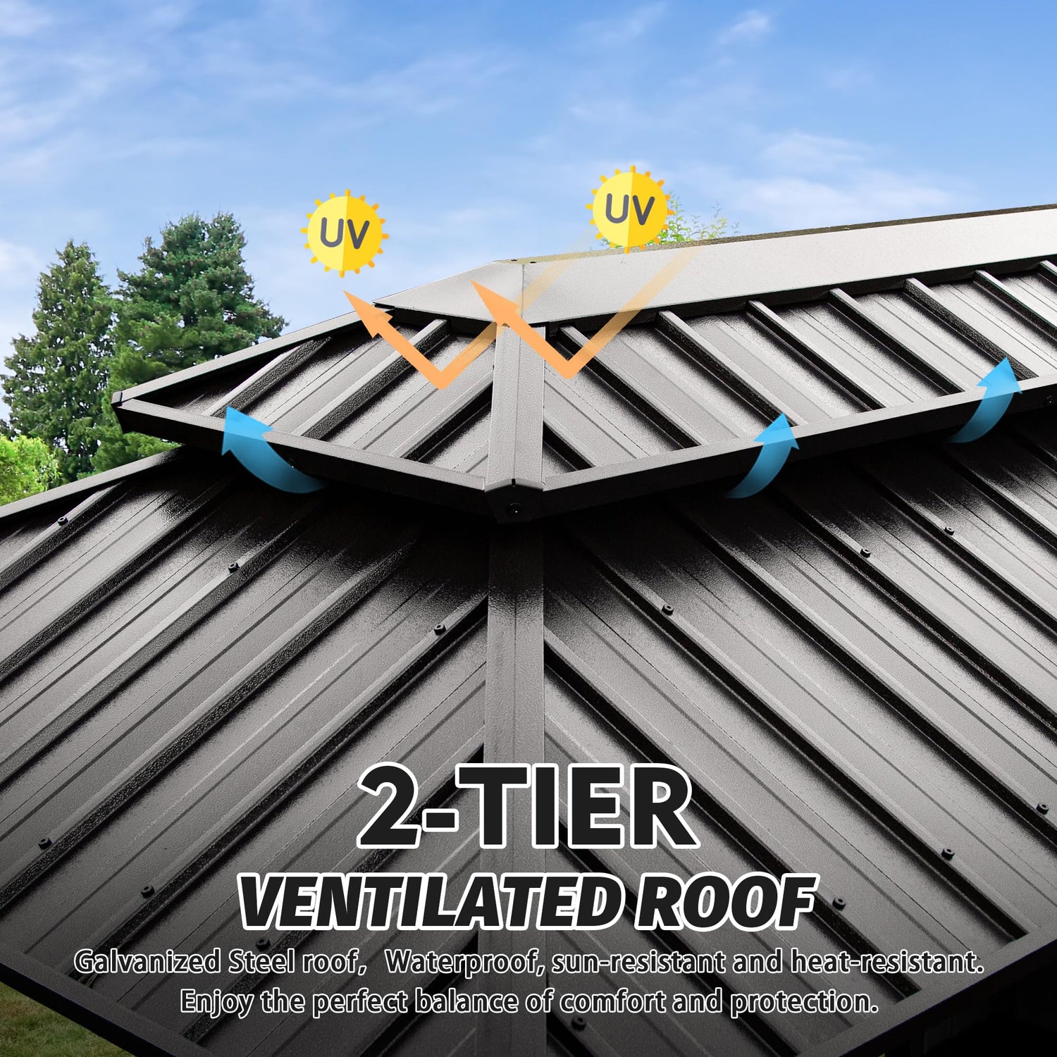 - Durable Galvanized Steel Roof- Built to withstand the elements, the Domi Hardtop Gazebo features a high-quality powder-coated galvanized steel roof. This UV-resistant, durable roof shields you from the sun’s harsh rays while remaining sturdy enough to endure heavy rain, wind, and even snow.