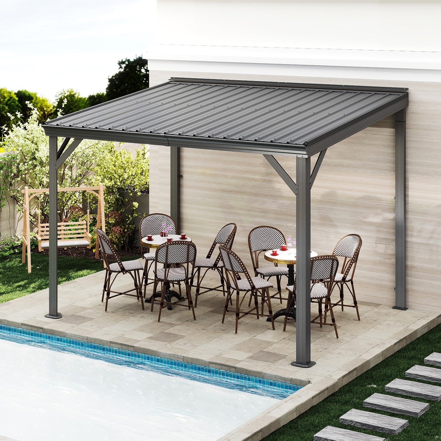 - 🏡Contemporary Design: Domi permanent wall mounted gazebo crafted with premium materials, not only offers exceptional practicality and durability but also exudes a distinctive sense of fashion that perfectly aligns with current aesthetic trends.
