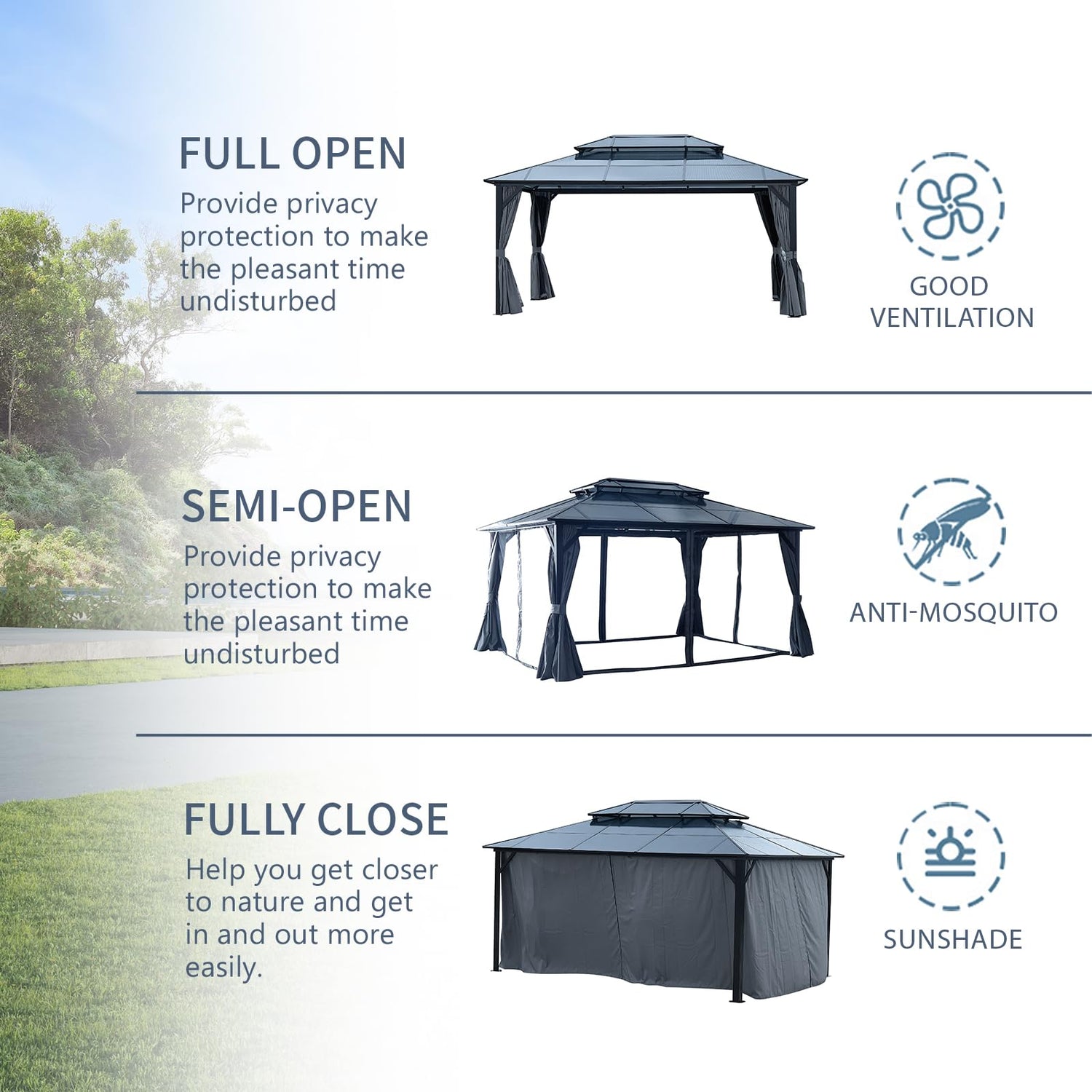 • All-Weather Durability: Our 12 x 16FT outdoor hardtop gazebo is built to withstand the elements, thanks to its galvanized steel double-roof and rust-proof aluminum frame. Designed for year-round use, this gazebo is weatherproof, fade-proof, and resistant to corrosion, ensuring long-lasting durability.