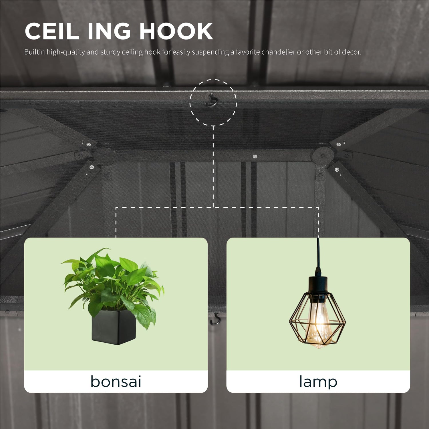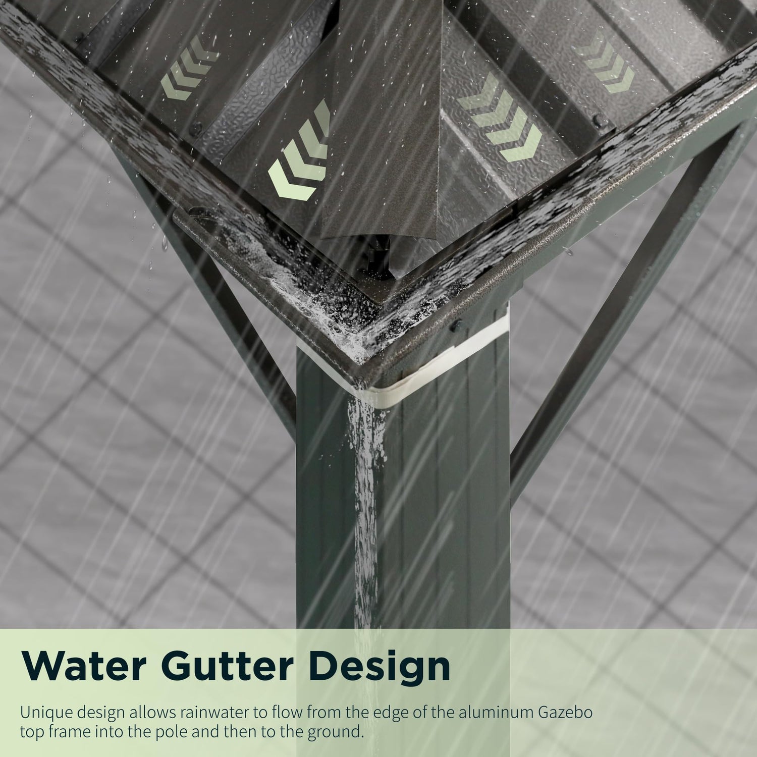 - ✅ 【Efficient Drainage System & Hooks】The unique water gutter design allows water to gather at the edge of the metal gazebo roof and flow to the ground through the aluminum post, reducing issues during rainy or snowy seasons. The roof’s center has hooks for hanging electric lights or fans, each capable of supporting up to 20 lbs.