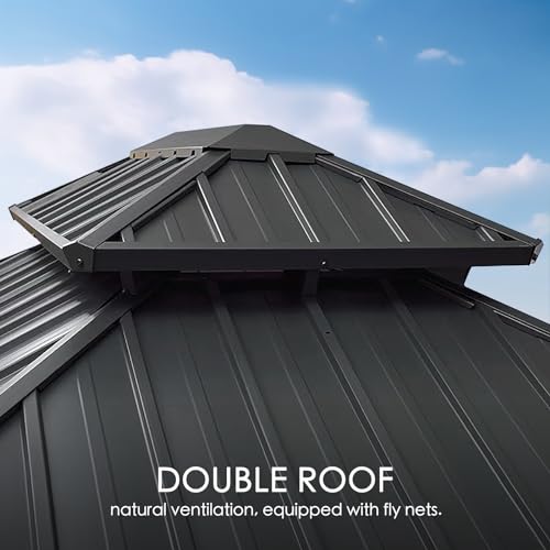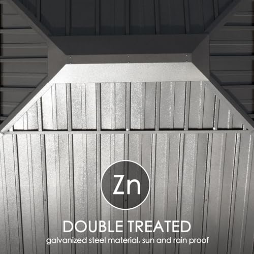 - ✅Metal Canopy/Roof and Gutter Design - The metal canopy of this gazebo ensures longevity and durability. Its roof, made of sheet metal, boasts a robust 29-gauge thickness, which is thicker than most gazebos on the market. its water gutter system ensures that rainwater is efficiently directed away from the edges of the frame and poles.