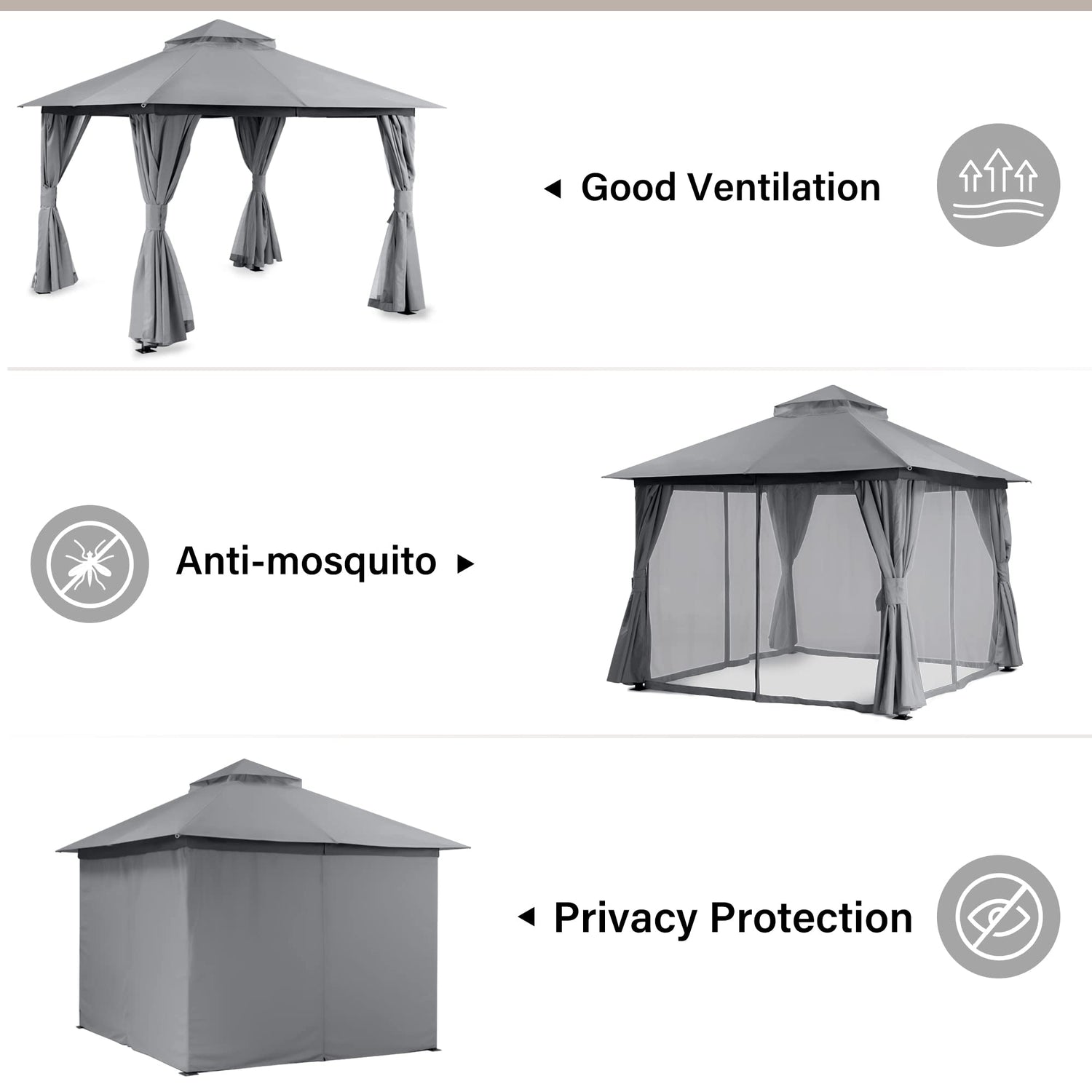 - ✔Ventilated Double-Roof✔: The ventilated double-roof design is attractive and functional, providing ventilation to keep the interior cool and keeping mosquitoes away with nettings between the tops. Perfect for outdoor events like parties and gatherings with family and friends. Having a comfortable and shaded outdoor space to enjoy during the warmer months is essential.
