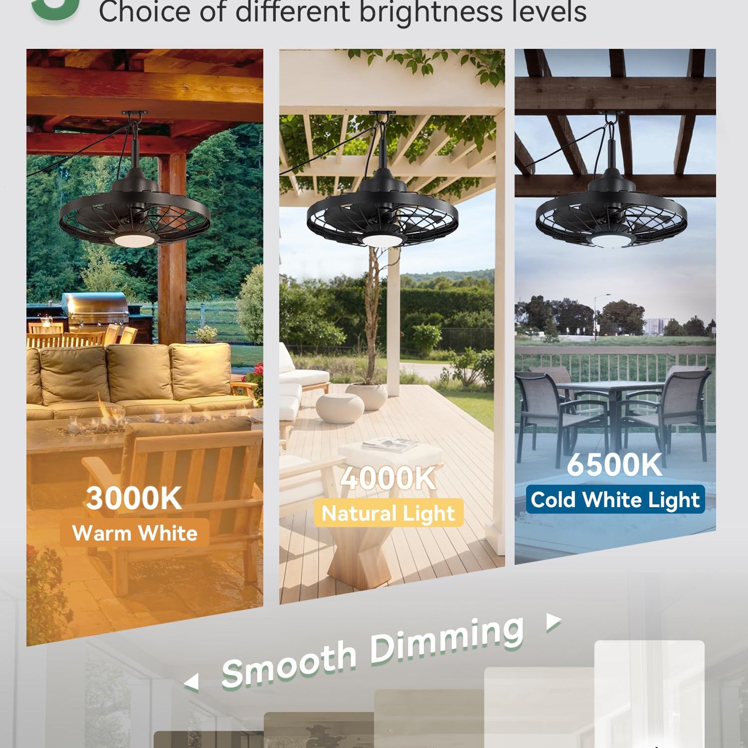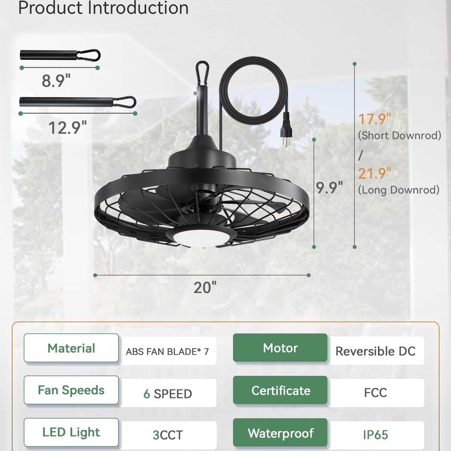 LEDIARY 20" Outdoor Ceiling Fan with Lights,IP65 Waterproof Gazebo Hanging Fan with Remote Control Smart App, Plug in Caged Ceiling Fan with 3CCT 6-Speeds for Patio Porch Pergola(Black)