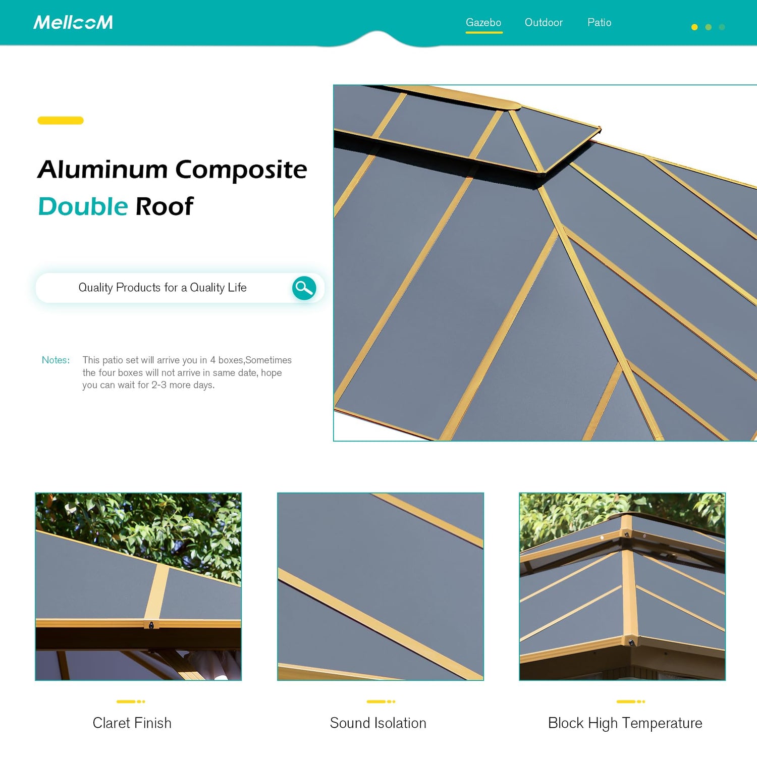 - 🏡【Aluminum Composite Panel 】The gazebo for patio uses high-end aluminum-plastic material as our panel. Compared with the ordinary galvanized steel roof, this material can block strong light and 99% harmful ultraviolet rays, can effectively block the high temperature in sunny days and ensure the sound insulation effect when it rains. The perfect aluminum composite panel has enough strength to withstand heavy snow and well cope with various weather conditions.