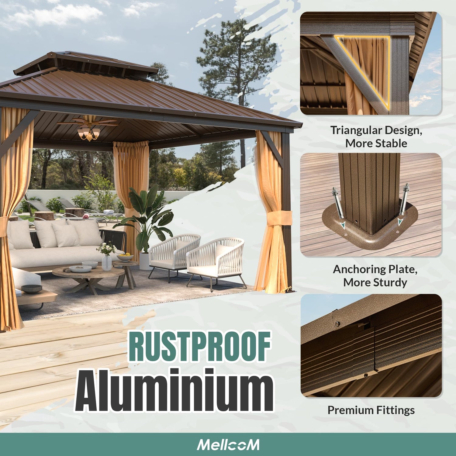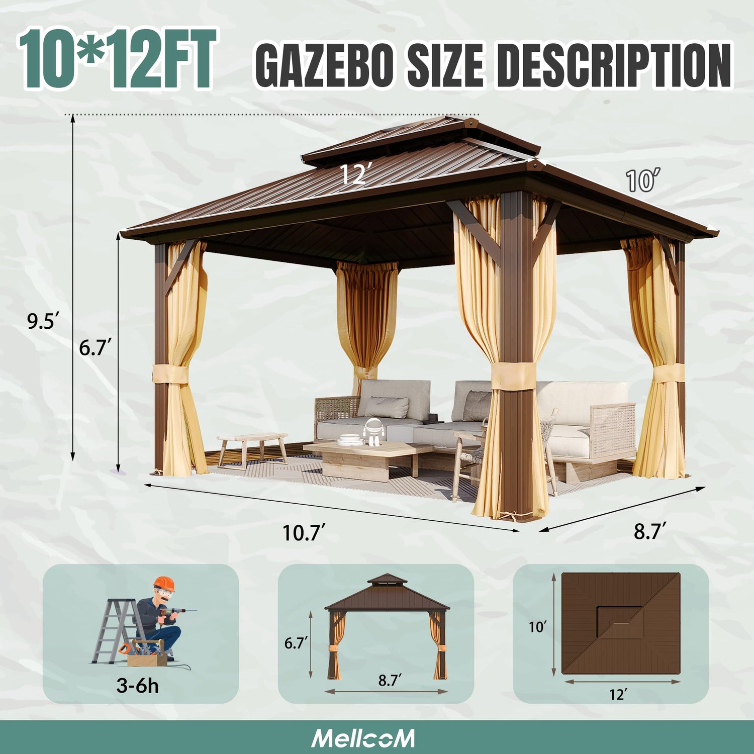 - Spacious, Low-Maintenance, Versatile: Relax in MELLCOM 10x12 gazebo, where you'll find ample space for gatherings, relaxation, and entertainment. With minimal maintenance needed, cherish every outdoor moment, from social gatherings to peaceful lounging.
