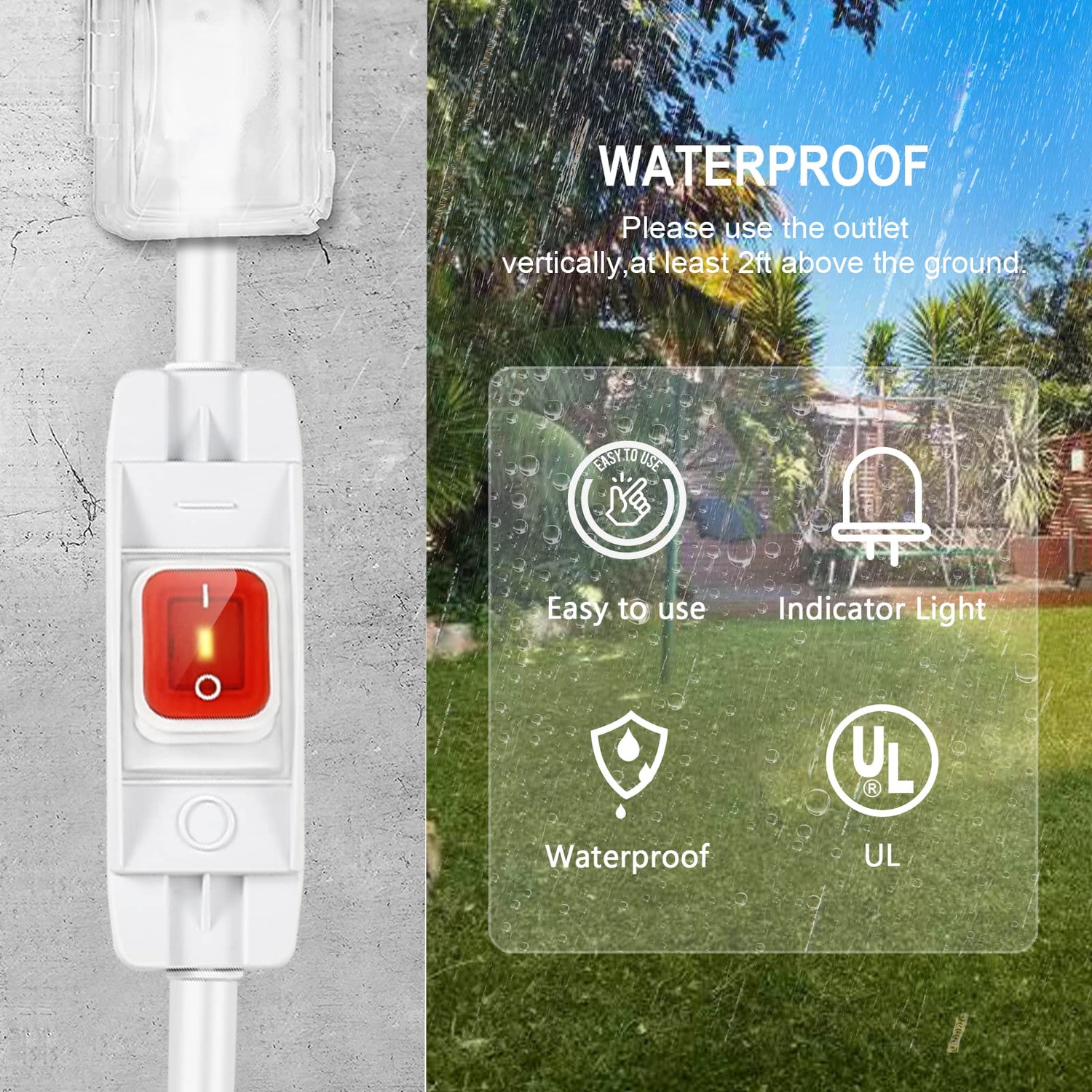 - Outdoor Waterproof Switch: the outdoor extension cord with waterproof switch,3 prong extension cord with one key control switch is about 15 ft in length versatile cord.