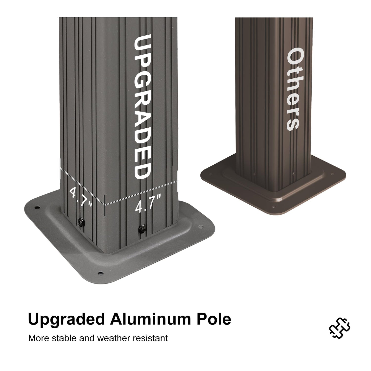 - Enhanced Stability: Our gazebo's 4.7-inch wide aluminum poles surpass the industry standard in width, offering unmatched durability and stability for reliable, long-lasting outdoor use.