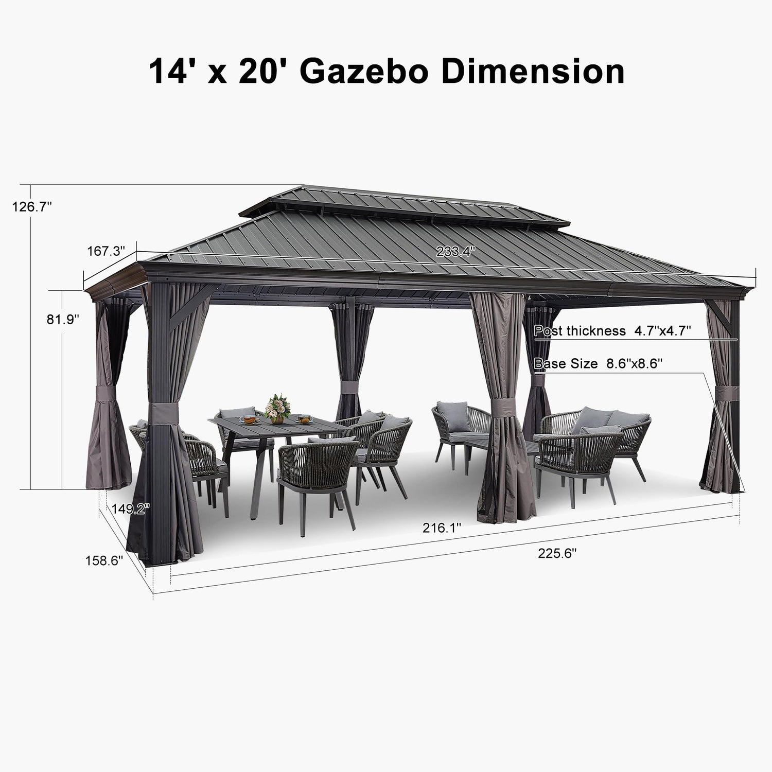 - High-quality Materials: Built with a galvanized steel roof and powder-coated aluminum frame with pre-drilled holes base, designed for sturdy installation, offers stability in windy conditions.