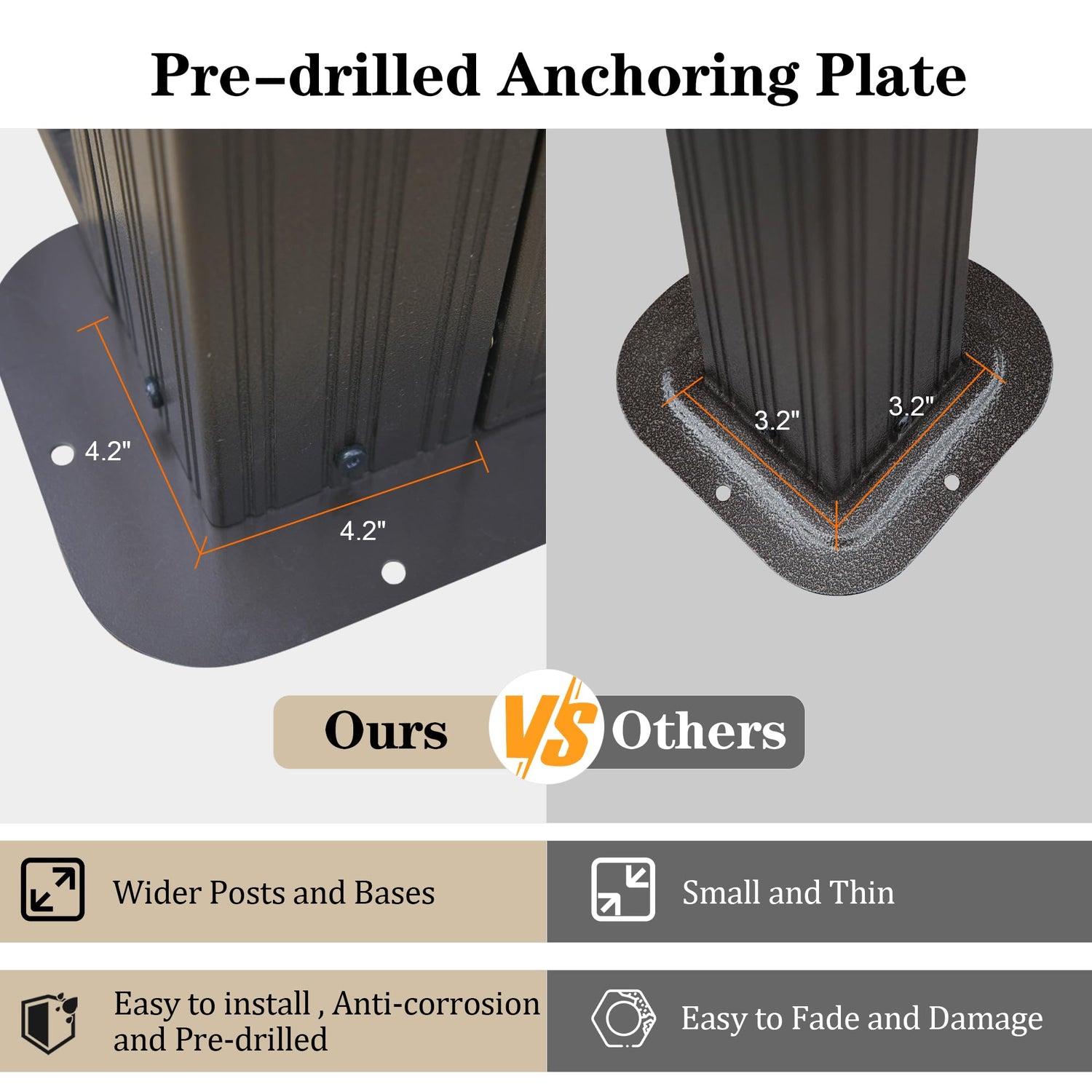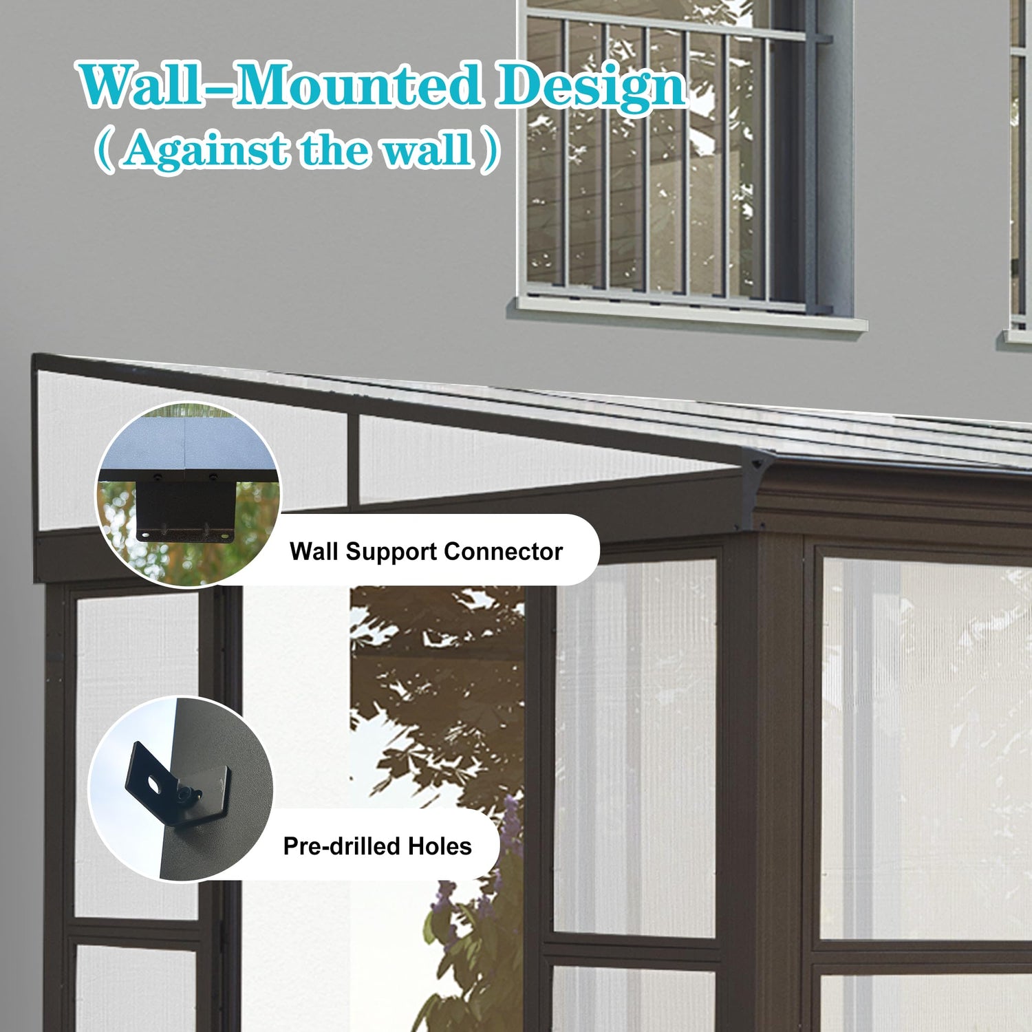 - Sturdy Aluminum Construction: Our metal sunroom shade structure is built with powder-coated aluminum, offering maximum scratch and corrosion resistance. Additionally, pre-drilled plate allow to secure the gazebo to sturdy surfaces like concrete, enhancing durability and stability in windy and rainy conditions.