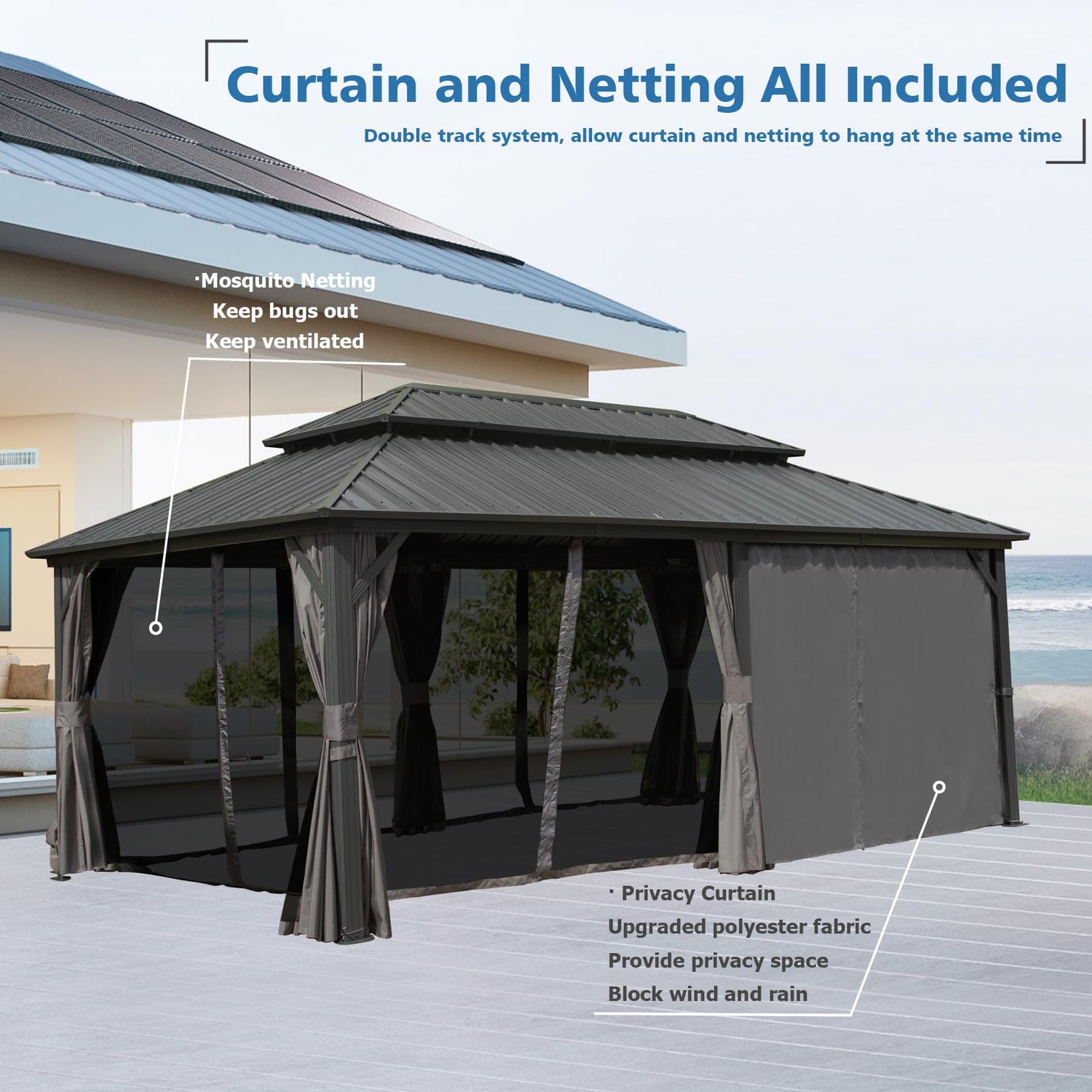 SHPAI 12’ x 20’ Hardtop Gazebo, Outdoor Aluminum Gazebo with Galvanized Steel Double Roof Canopy, Outdoor Permanent Metal Pavilion with Curtains and Netting for Patio, Backyard and Lawn, Dark Grey